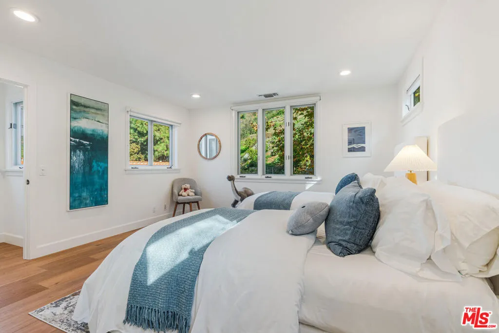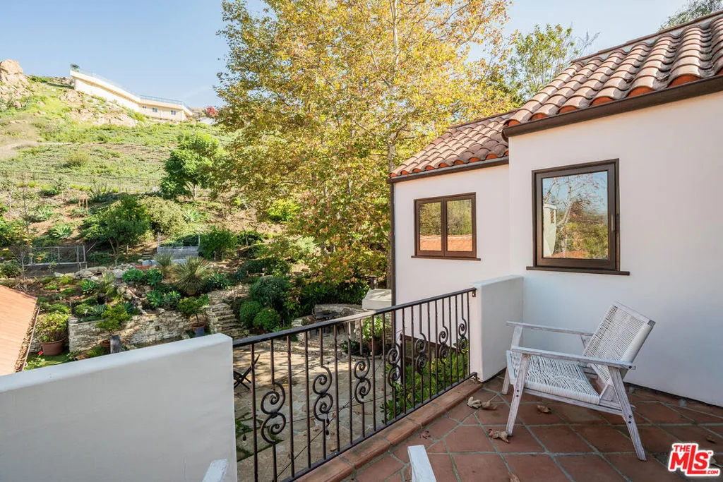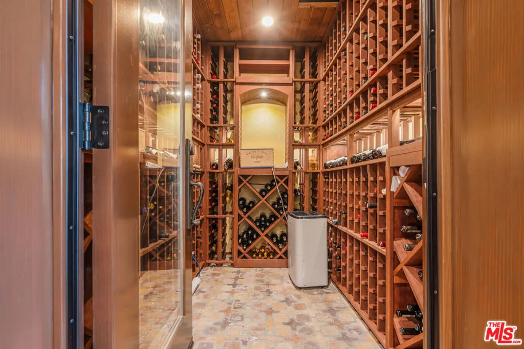 Experience timeless design and modern coastal living in this beautifully renovated Spanish-style estate located in the highly desirable Palisades Hills Estates. Thoughtfully renovated and beautifully appointed, this spacious home offers exceptional craftsmanship, seamless indoor-outdoor flow, and a detached guest studio, perfect for family, guests, or a private office. The elegant, vaulted entryway opens to a grand living room and formal dining area with dramatic beamed ceilings, and beautiful, modern, wood floors throughout the home. The heart of the home is an expansive great room that seamlessly connects to a gourmet chef's kitchen featuring top-tier stainless steel appliances, marble countertops, and a generous, walk-in butler's pantry. A 700+ bottle, temperature-controlled, wine room is ideal for storing those perfect bottles of wine for those special occasions. Multiple rooms open to the outdoors, creating a natural connection to the lush gardens and patio spaces. Upstairs, the primary suite is a serene retreat with a vaulted sitting room, private balcony, dual walk-in closets, and a spa-inspired bath with a luxurious, free-standing tub, steam shower, and dual vanities. Two additional ensuite bedrooms upstairs offer comfort and privacy. Additionally, there is separate, designated office on the main level which could act as an additional bedroom in the main house. The backyard is an entertainer's dream, complete with mature landscaping, fruit trees, garden paths, a built-in BBQ, Tuscan split rock pizza oven, a tranquil waterfall pond, and a romantic covered patio with fireplace. Residents of Palisades Hills Estates enjoy exclusive access to a private recreation club with pool, spa, tennis, pickleball, and basketball courts, offering a true resort-style lifestyle just minutes from the heart of Pacific Palisades.