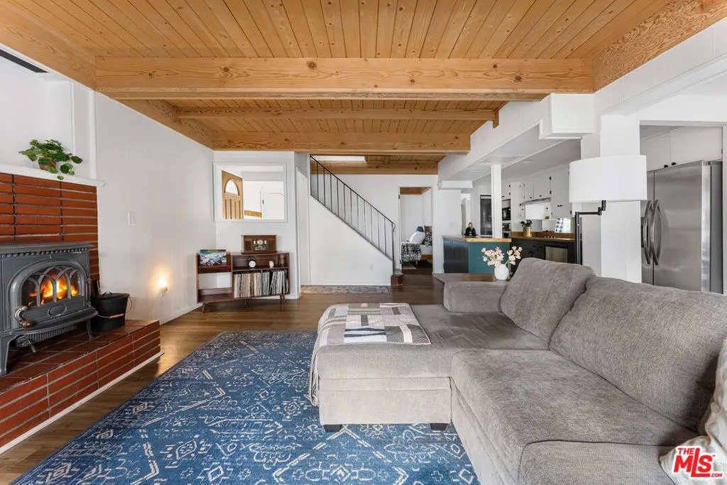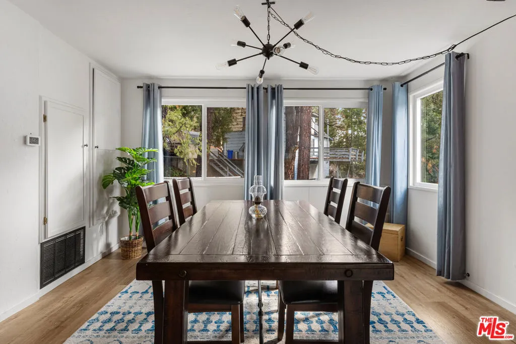 Nestled in a premier neighborhood on Sunset Drive, this thoughtfully renovated mountain retreat is notable for blending rustic with contemporary features. The home greets you with an open-concept design that maximizes natural light, creating a bright and airy atmosphere that is immediately welcoming. The main living area is defined by striking custom walnut-blasted ceilings and new flooring that flows seamlessly throughout. Whether you are gathering around the cozy stove fireplace or hosting in the renovated kitchen - fully equipped with new appliances and artisanal wood countertops - the space feels both intimate and expansive. The adjacent dining room offers a generous footprint, making it the perfect setting for hosting memorable dinners with family and friends. The home's versatility extends to its sleeping quarters and lower level, where comfort meets potential. Each of the three bedrooms are designed for privacy and rest, while the renovated bathrooms feature simple contemporary finishes. The expansive, built-out basement is a true highlight, featuring a second fireplace and a continuation of the walnut-blasted beamed ceilings. This level includes a full bathroom and offers the flexibility to serve as a grand fourth bedroom, a high-end media room, or a premier recreation hub. All new windows have been recently installed throughout the home. In addition, there is a generator hookup. Outside, the property invites you to embrace the mountain lifestyle from the inviting deck or the quiet yard, both offering a serene vantage point for the surrounding landscape. Practicality is also a priority, with ample parking and storage space, which makes this a seamless transition for homeowners or a turnkey opportunity for investors. Perhaps one of the property's greatest assets is its proximity to local culture; you are within close distance of a beloved community coffee shop and restaurant, and just a short drive from boutique shopping, gourmet markets, farmer's markets, and world-class hiking trails. With Lake Arrowhead just 15 minutes away, this stunning cabin represents a rare and move-in-ready investment in one of the region's most sought-after locations.