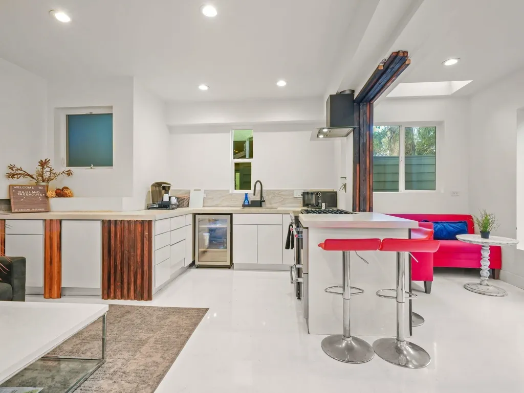 Three levels of pure serenity await in this stunning hillside retreat designed for both grand entertaining and peaceful everyday living.The top floor showcases an airy open-concept layout, framed by floor-to-ceiling windows and a wall of glass that opens to a deck spanning the entire length of the home. Perfect setting for hosting unforgettable gatherings with friends and family while enjoying indoor-outdoor living. This level also features two generously sized bedrooms, a full bathroom, and a stylish kitchen complete with quartz countertops, newer appliances, and a modern backsplash.The entire next level is dedicated a true private oasis. This expansive retreat includes a spa-like bathroom with a deep jetted soaking tub, an open dual-headed shower, and a spacious walk-in closet. Large windows and an extended private deck create a tranquil escape. Adding incredible value and versatility is the beautifully designed ADU. This open-concept space features a cozy gas fireplace, concrete kitchen counters with breakfast bar, an eat-in nook, and a thoughtfully designed bathroom with a deep standalone tub and open shower area. The large bedroom includes a walk-in closet and a comfortable sitting area—ideal for guests, extended family, or rental income.
