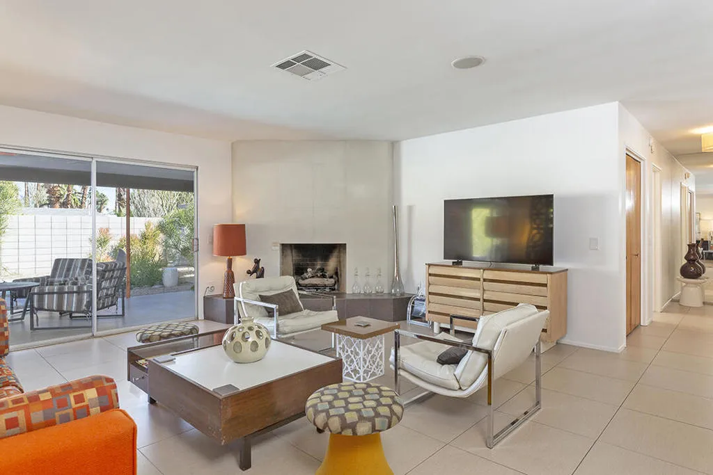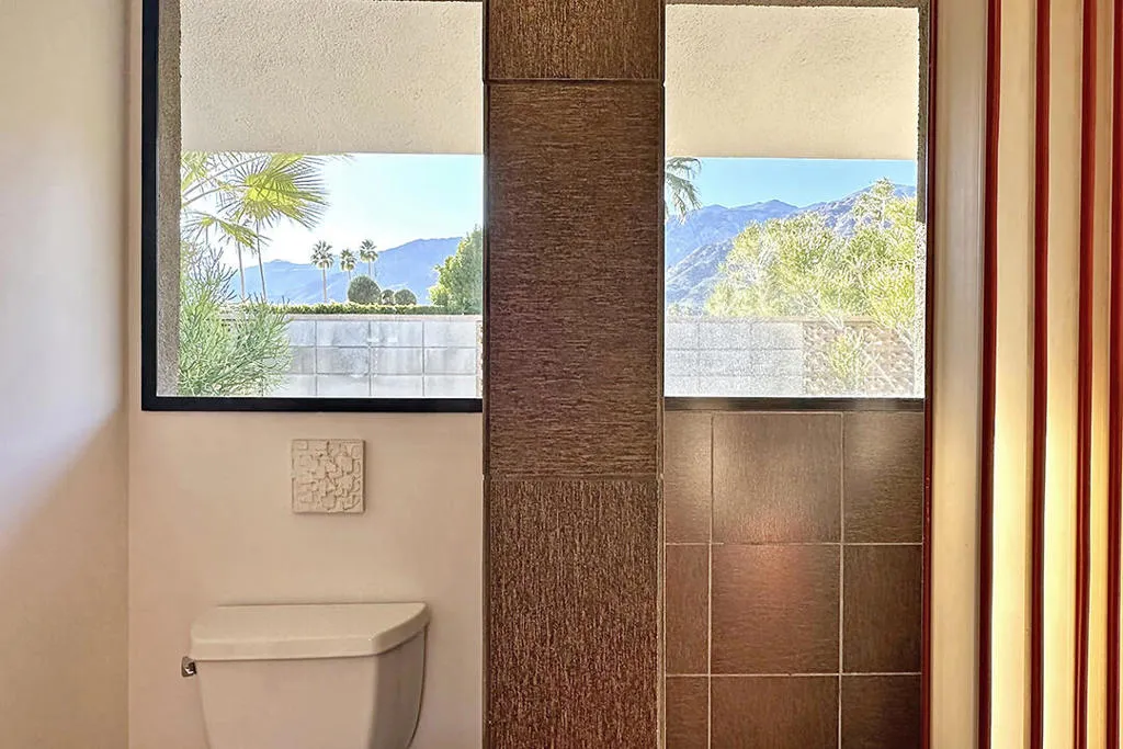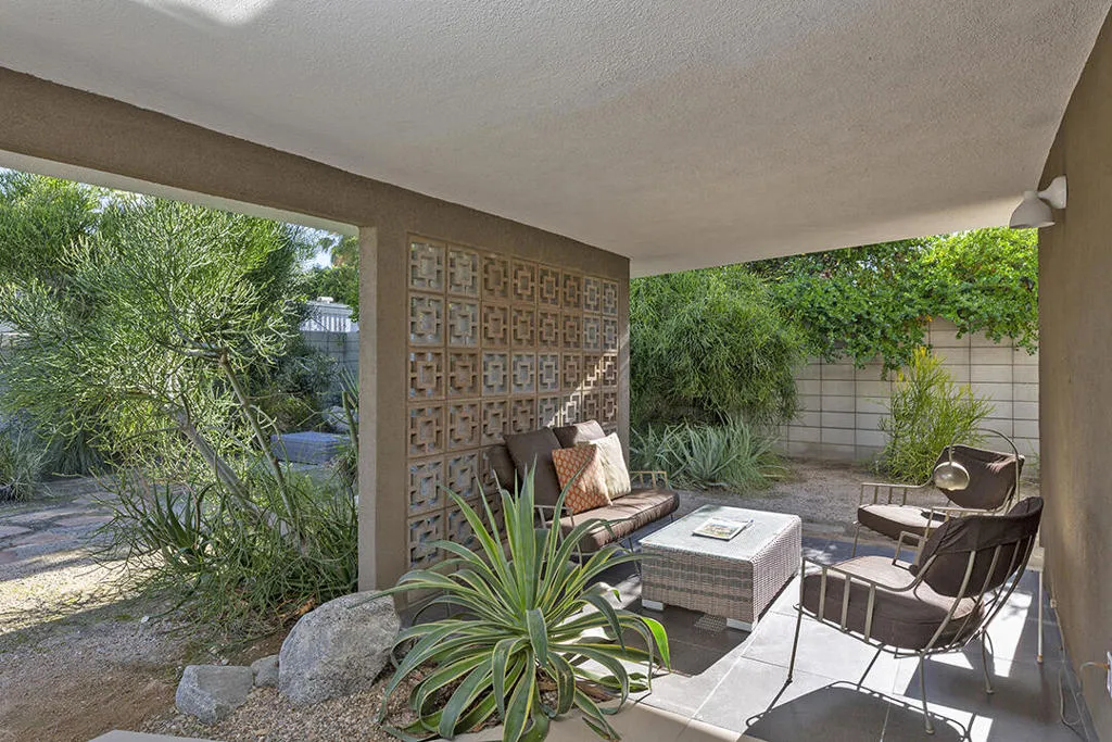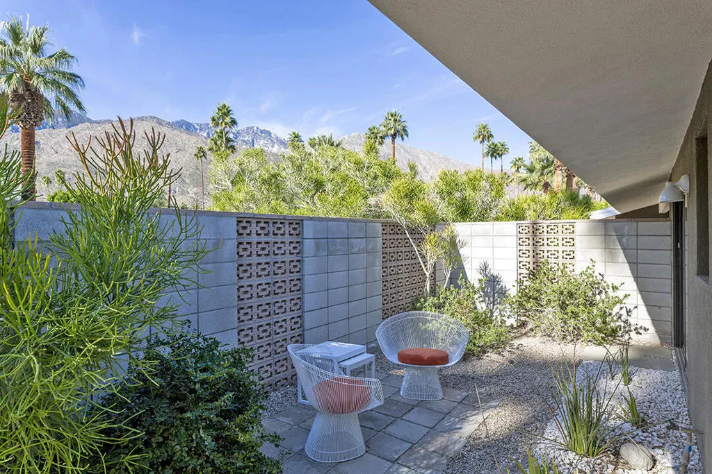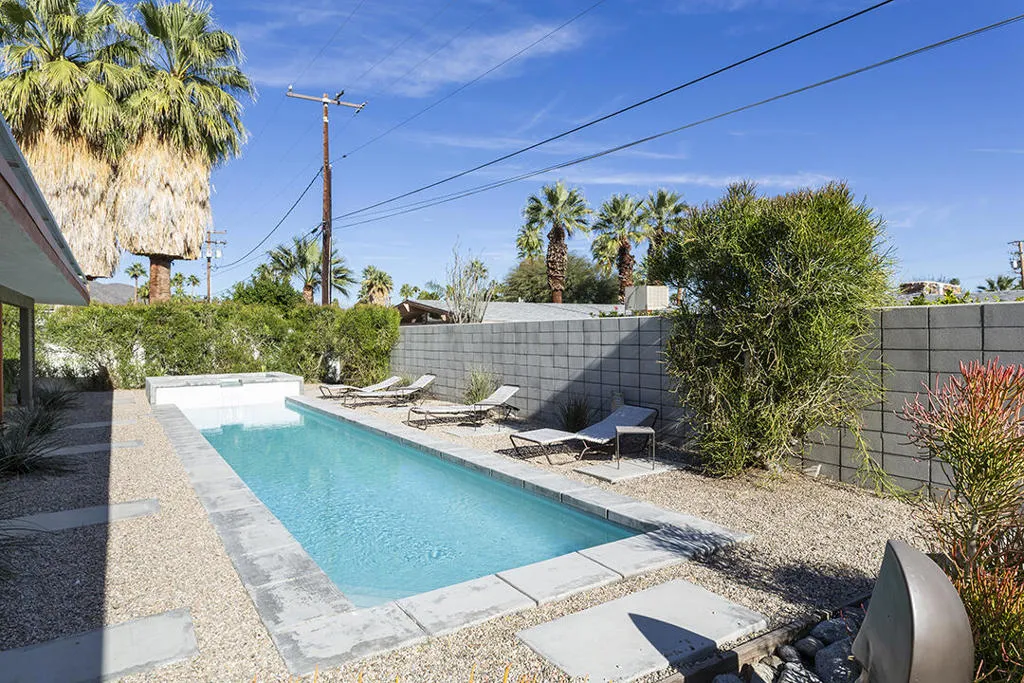Escape to this entertainment hideaway located in the heart of Palm Springs' historic mid-century Twin Palms neighborhood. Extensively updated in 2013, this stylish El Camino Estates 3-bedroom, 3-bathroom home has been thoughtfully curated to preserve and expand upon its vintage heritage.Nestled within a natural high-desert landscape, sculpted berms and native desert plantings create privacy and intrigue for the single-story structure that has a courtyard accented with breeze block and a low-profile roofline with a gravel finish. Entering through the original double front doors, the open floor plan incorporates breeze-block partitions to define the living, dining, and kitchen areas. Features include the living room's corner gas fireplace and original mirrored display cabinet, and multiple sliding glass doors that open to a covered rear patio.The rear patio extends 75 feet along the back of the home, featuring multiple open skylights and repeating the breeze-block partitioning to create conversation areas and gathering points. The interplay of shade and sun is enchanting, with the freshly replastered lap-pool and spa just beyond. A side-yard fire pit with mountain views and an outdoor shower further enhance the resort-style setting.There is a chef's kitchen with a dining nook offering ample space for entertaining. It features a combination of white cabinetry, Caesarstone countertops, a prep island, and white appliances. The rear patio's barbecue station with a classic vent hood is right outside. The kitchen also includes a washer and dryer closet, pantry, and access to the two-car garage. The primary bedroom features a walk-in closet and an en-suite bath as well as sliding doors opening to a dedicated outdoor conversation area on the back patio. The en-suite bath's updates incorporate designer Formica accents on the restored 1960s cabinetry, paired with fresh solid-surface countertops and complimentary shower tile. Two additional bedrooms are located at the front of the home, both with mountain views and featuring sliding doors opening to the front courtyard, where each has a dedicated outdoor seating area for relaxation. Between these bedrooms is a shared Jack-and-Jill bath with windows that provide stunning mountain views while showering. Its vintage design includes earth-tone ceramic and glass tile, a restored 60s vanity, and a mid-century slatted shower curtain.This home also has a guest half bath and leased solar.