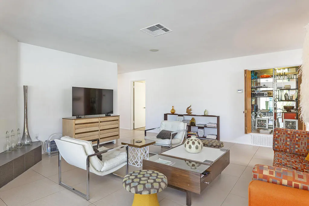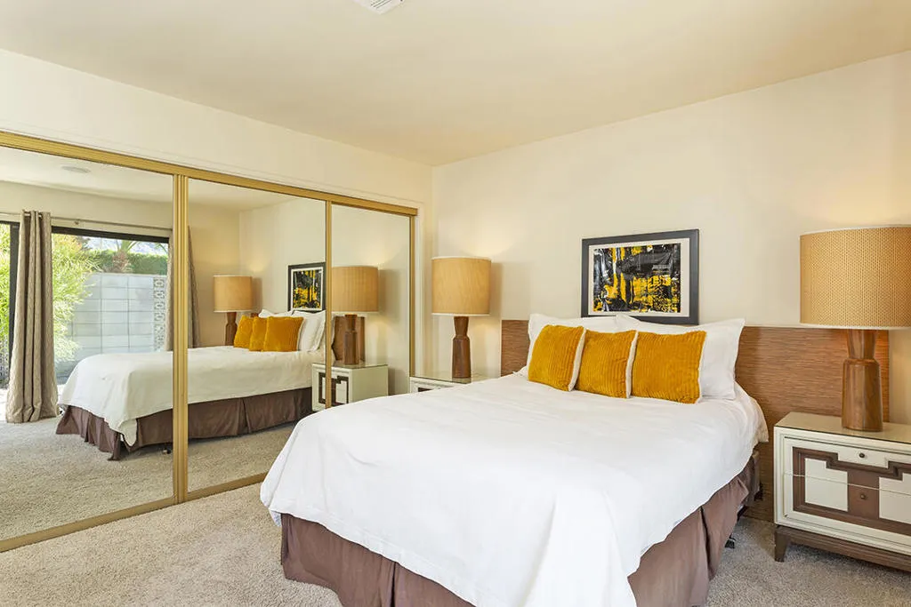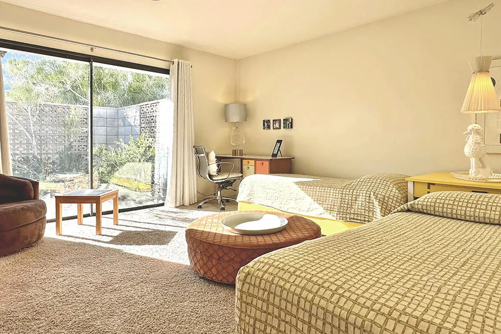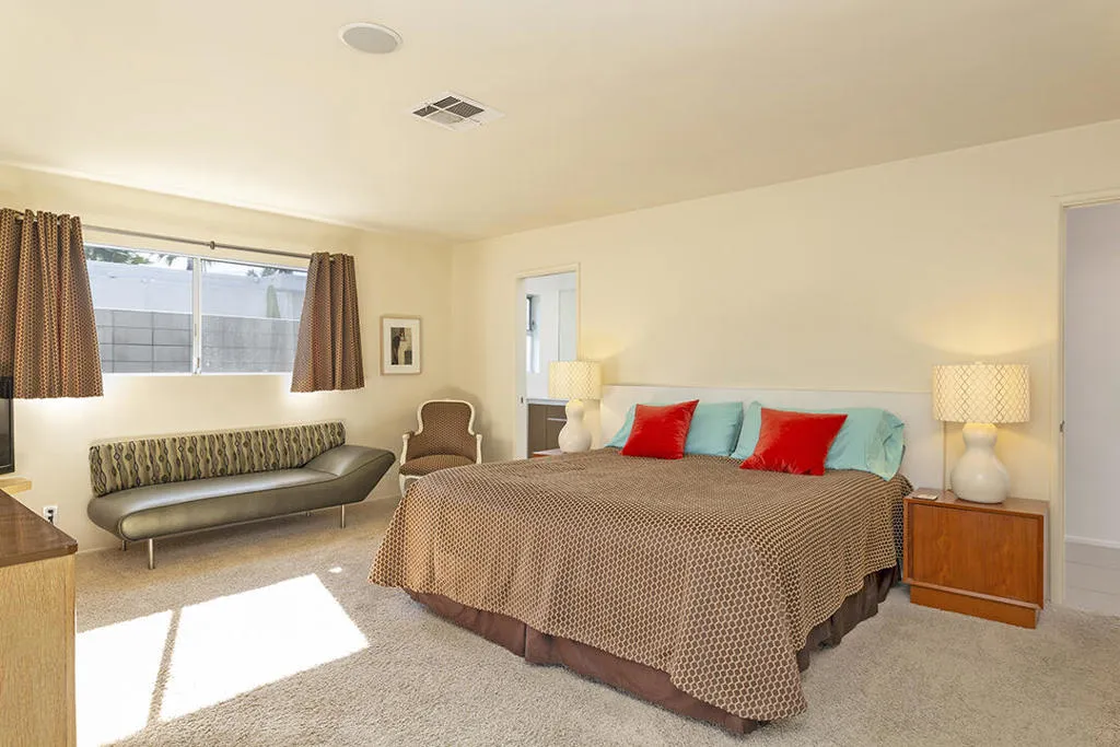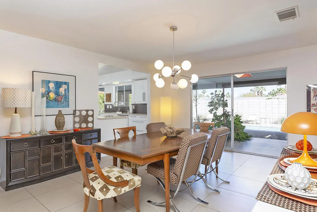Escape to this entertainment hideaway located in the heart of Palm Springs' historic mid-century Twin Palms neighborhood. Extensively updated in 2013, this stylish El Camino Estates 3-bedroom, 3-bathroom home has been thoughtfully curated to preserve and expand upon its vintage heritage.Nestled within a natural high-desert landscape, sculpted berms and native desert plantings create privacy and intrigue for the single-story structure that has a courtyard accented with breeze block and a low-profile roofline with a gravel finish. Entering through the original double front doors, the open floor plan incorporates breeze-block partitions to define the living, dining, and kitchen areas. Features include the living room's corner gas fireplace and original mirrored display cabinet, and multiple sliding glass doors that open to a covered rear patio.The rear patio extends 75 feet along the back of the home, featuring multiple open skylights and repeating the breeze-block partitioning to create conversation areas and gathering points. The interplay of shade and sun is enchanting, with the freshly replastered lap-pool and spa just beyond. A side-yard fire pit with mountain views and an outdoor shower further enhance the resort-style setting.There is a chef's kitchen with a dining nook offering ample space for entertaining. It features a combination of white cabinetry, Caesarstone countertops, a prep island, and white appliances. The rear patio's barbecue station with a classic vent hood is right outside. The kitchen also includes a washer and dryer closet, pantry, and access to the two-car garage. The primary bedroom features a walk-in closet and an en-suite bath as well as sliding doors opening to a dedicated outdoor conversation area on the back patio. The en-suite bath's updates incorporate designer Formica accents on the restored 1960s cabinetry, paired with fresh solid-surface countertops and complimentary shower tile. Two additional bedrooms are located at the front of the home, both with mountain views and featuring sliding doors opening to the front courtyard, where each has a dedicated outdoor seating area for relaxation. Between these bedrooms is a shared Jack-and-Jill bath with windows that provide stunning mountain views while showering. Its vintage design includes earth-tone ceramic and glass tile, a restored 60s vanity, and a mid-century slatted shower curtain.This home also has a guest half bath and leased solar.