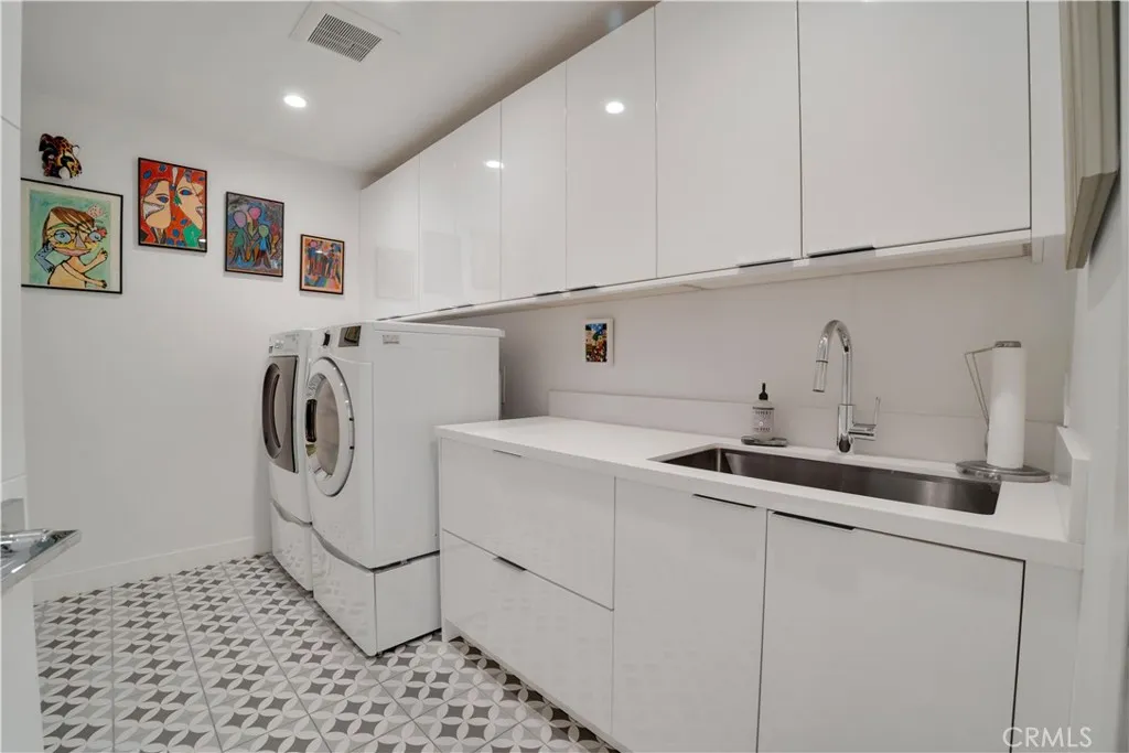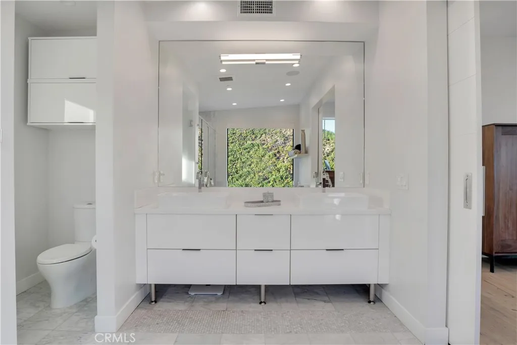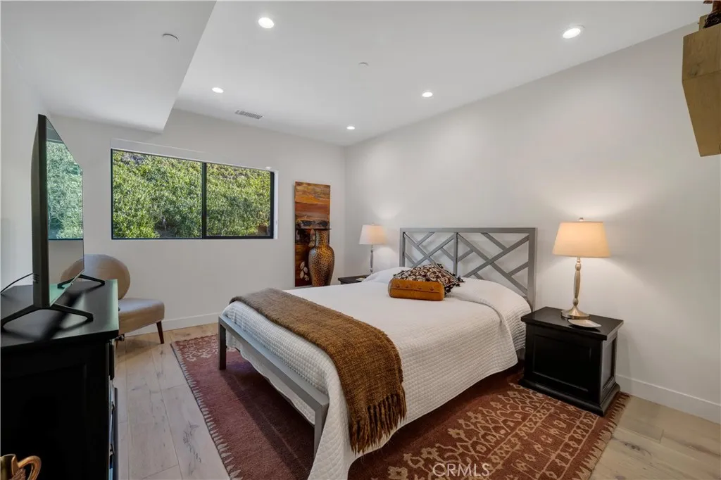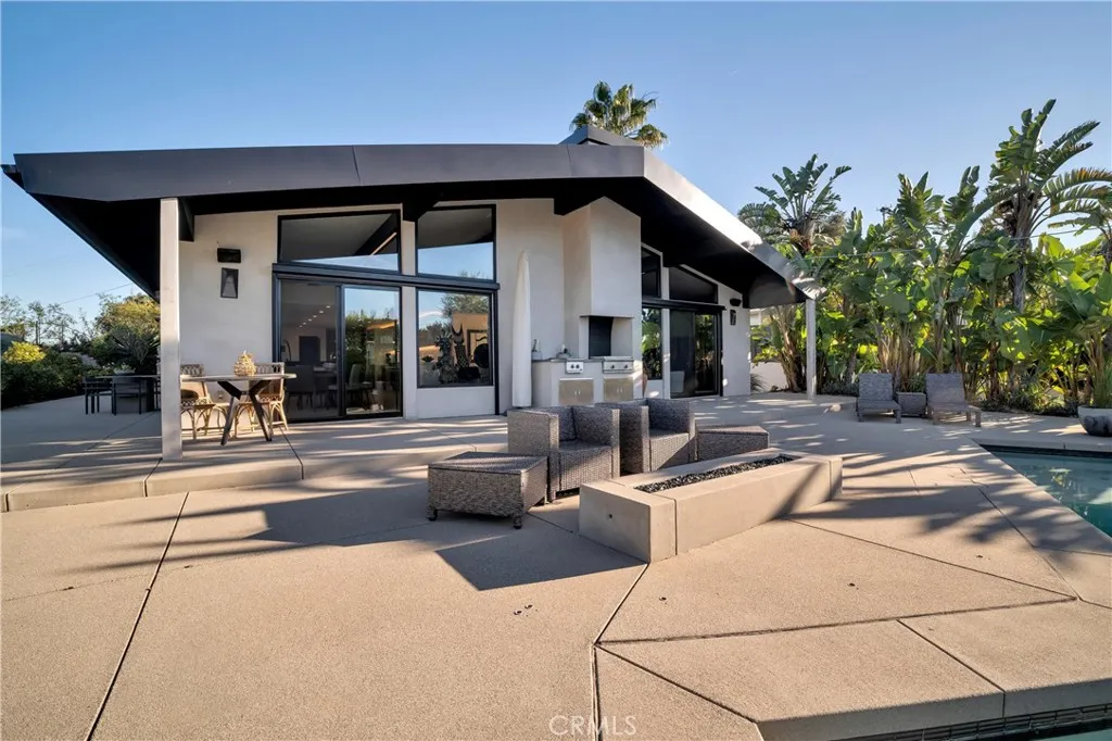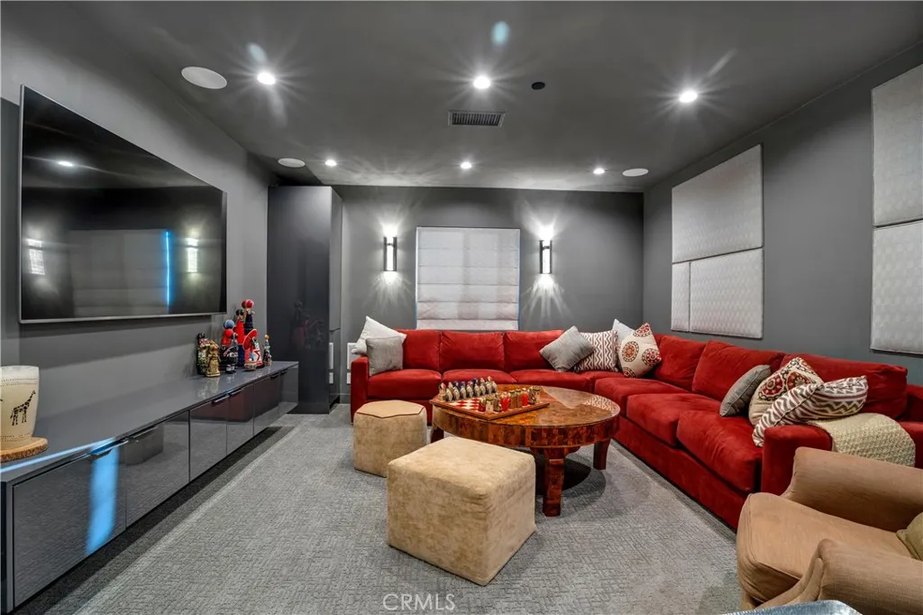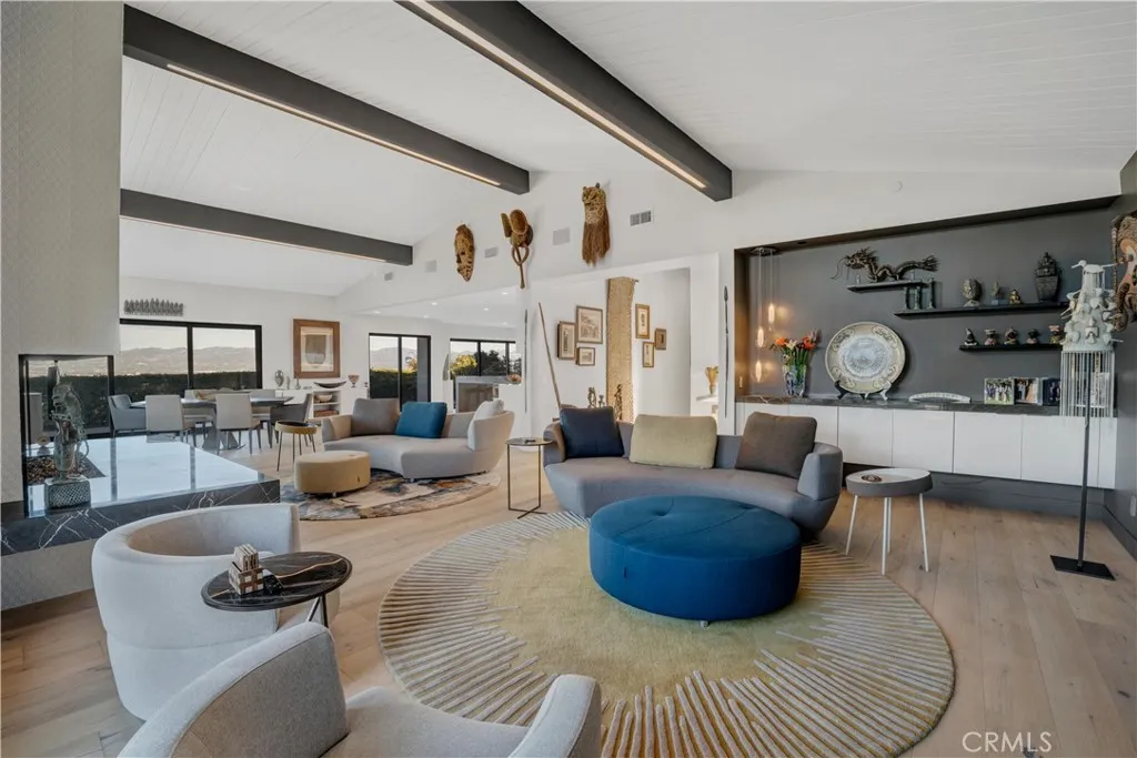 Commanding 180° valley views from a rare elevated perch above Encino with great privacy. Adjacent to the Encino Reservoir and perched to capture sweeping 180-degree panoramas across the San Fernando Valley, the home feels suspended above it all: quiet, luminous, and profoundly private. Spanning approximately 4,755 square feet, this 5-bedroom, 5.5-bath home is a refined contemporary reimagining of its mid-century origins, fully rebuilt in 2019 with exceptional taste and architectural restraint. Walls of glass dissolve the boundary between indoors and out, framing the ever-changing valley below and bathing the interiors in natural light from dawn through dusk. A long, gated approach heightens the sense of arrival. Inside, a dramatic great room unfolds with soaring vaulted, beam-accented ceilings, an oversized statement fireplace, and a built-in bar—an expansive yet intimate space designed for both quiet evenings and large-scale entertaining. The home flows effortlessly to outdoor terraces, where the view remains the constant focal point. The open kitchen is sleek and purposeful, anchored by a generous central island, custom cabinetry, and high-end appliances, with a sunlit breakfast area positioned to take full advantage of the vistas. Multiple ensuite bedrooms provide flexibility for guests, office, gym, or media use, including a sound-insulated den or theater. Upstairs, the primary suite is a true sanctuary, featuring dual walk-in closets, a spa-caliber bath, and a private glass-railed balcony floating above the valley. Outdoors, the property becomes a private hillside resort: wraparound patios, pool with Baja shelf and spa, firepit, outdoor kitchen, lush landscaping, mature fruit trees, and abundant rose gardens. Thoughtfully rebuilt with luxury finishes, fire sprinklers, tankless water heaters, and an attached two-car garage, this is a home where design, engineering, and setting align—minutes from Ventura Boulevard, Mulholland, and the Sepulveda Pass. This is not simply a house with a view, but a rare vantage point above the city.