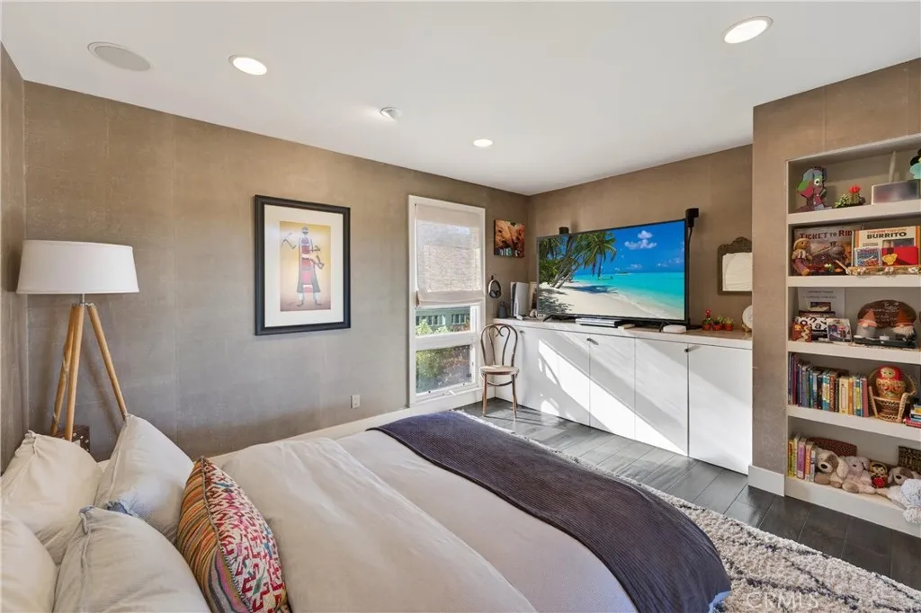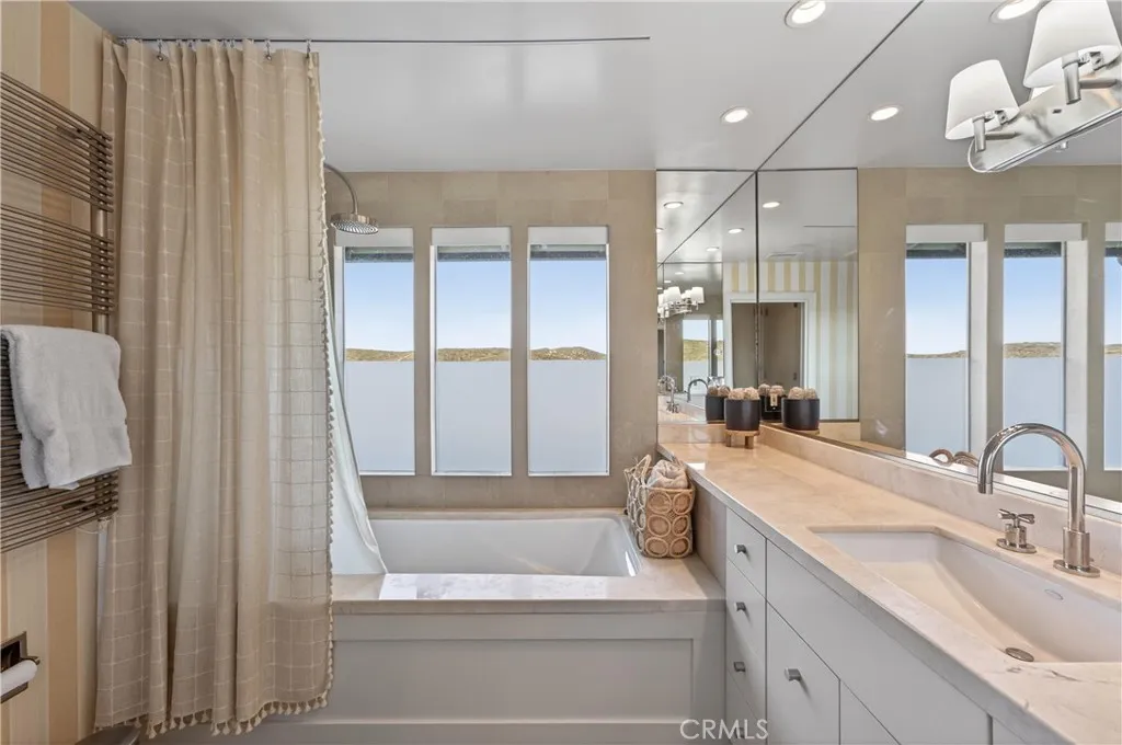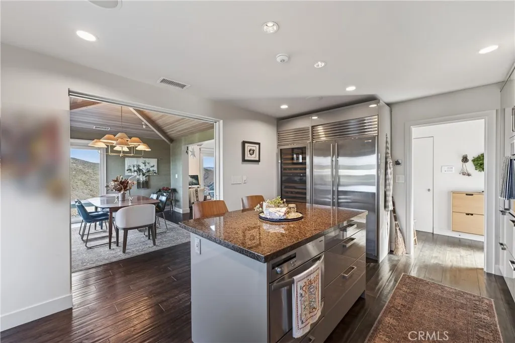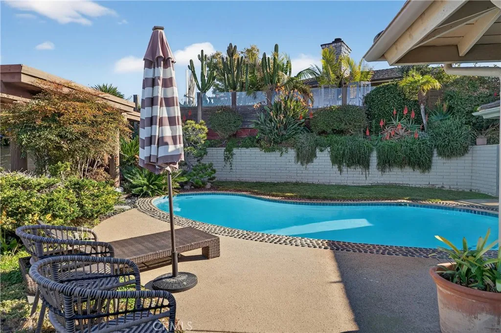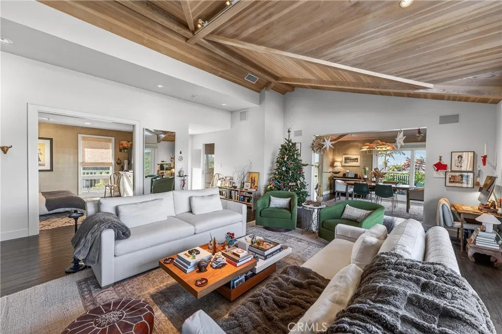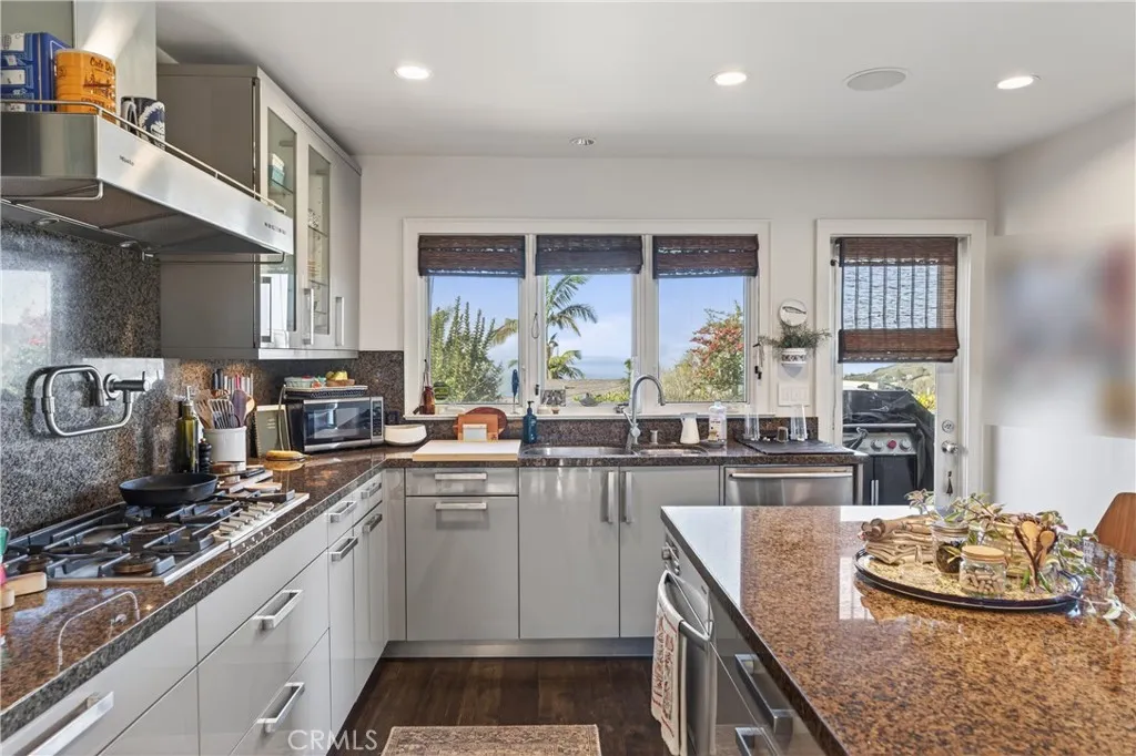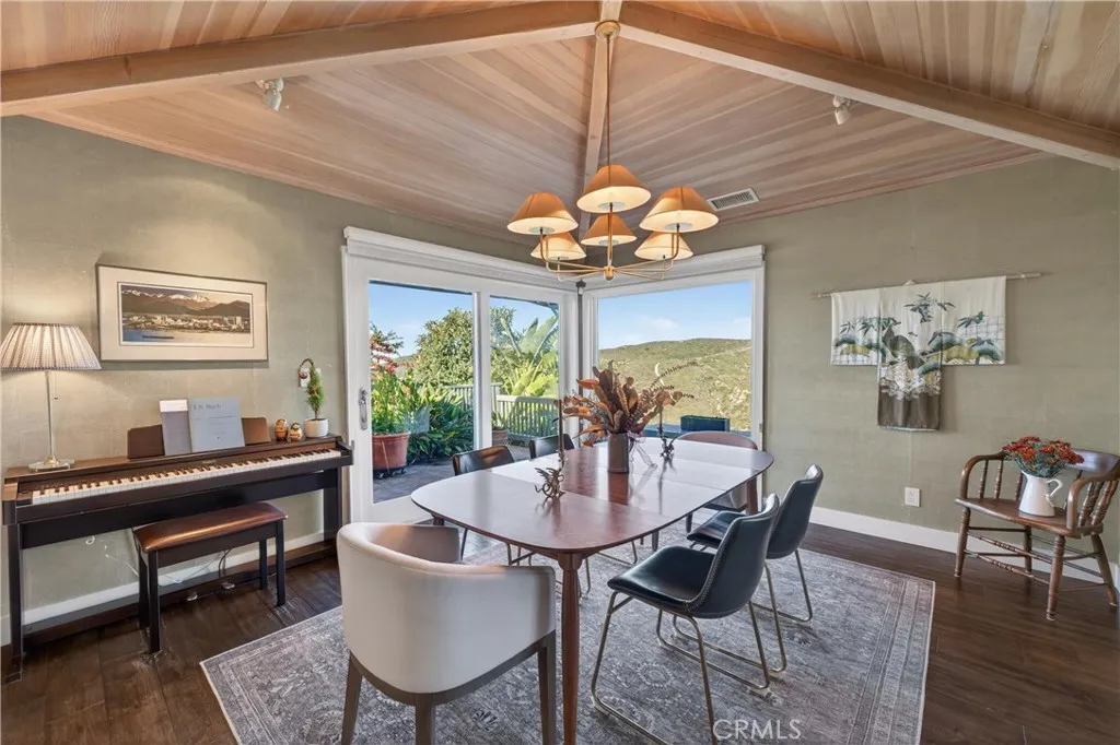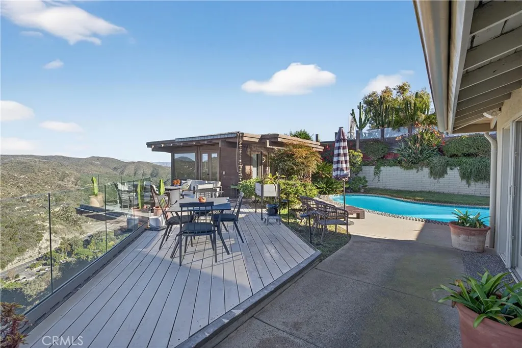 Single Level Ranch home in Prime Laguna Beach. Located in the desirable Mystic Hills, this stunning contemporary residence is situated on an ideal lot with ocean and panoramic canyon views. Only a few minutes from Laguna Main Beach. 3 bed, 2 bath entertainers dream main house with an additional DETACHED 1 bed and 1 bath guest house/casita comes with many architectural designs such as beamed high ceilings, built-in entertainment cabinets, soft LUTRON lighting, hardwood floors, and modern rounded wall edges and colors. Once inside, the spacious living room and dining room opens to a grand deck with a breathtaking panoramic canyon, ocean views and the swimming pool. Indoor outdoor living at it's best as well as a lawn area for the pets. Gourmet kitchen with Subzero and Miele appliances including a wine fridge, Rational German kitchen cabinets and pocket doors from the dining room kitchen separation. Guest house built like a modern retreat with shoji sliding screens with views of the pool, ocean and canyon. It provides a flexible space for possible ADU conversion, a home office, or artist studio, expanding the total living area to approximately 2020 square feet. Main house has hidden TV in cabinet over the fireplace. Garage has a stainless steel door and an electrical outlet for electric car charging. Ample street parking.