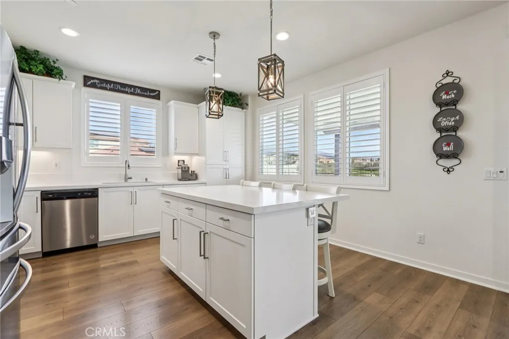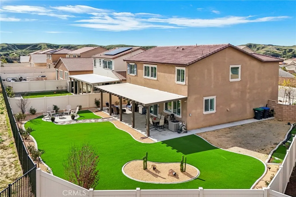 Welcome to The Fairway Community, where you can experience modern resort-style living at its finest. This breathtaking premium corner lot home sits on an expansive 7,815 sq. ft. lot overlooking The Legends GOLF COURSE with stunning MOUNTAIN VIEWS—a rare find in today’s competitive real estate market. Properties in this sought-after neighborhood consistently trend above average for both appreciation and desirability, making this an exceptional investment opportunity as well as a dream residence. The exterior features self-maintaining landscaping, including turf, decorative rocks, vinyl fencing, and drought-tolerant plantings, ensuring both excellent curb appeal and easy upkeep. The outdoor space is perfect for year-round entertaining, featuring an Alumawood patio cover with recessed lighting, ceiling fans, TV, and a dedicated BBQ and dining area—ideal for hosting gatherings or relaxing with loved ones while enjoying the scenic backdrop. Inside, you’ll find a bright, open 2,239 sq. ft. floor plan with four spacious bedrooms and three full bathrooms. A convenient main-floor bedroom and bath provide an ideal space for guests or multi-generational living. The chef’s kitchen is a showstopper, featuring white cabinetry, stainless steel appliances, quartz countertops, and a large island with designer pendant lighting and extra seating. Upstairs, a large loft offers flexible additional living space, while a well-appointed laundry room with extra storage adds everyday convenience. The spacious master suite offers picturesque views, a large walk-in closet, and a luxurious bathroom featuring dual quartz vanities, a soaking tub, and a walk-in shower, creating your own private retreat. Additional features include earth-tone luxury vinyl flooring, wood plantation shutters, recessed lighting, and ceiling fans throughout. This meticulously maintained home is truly move-in ready that includes a tankless water heater and "OWNED SOLAR!"—a major value in today’s energy-conscious market. Residents of The Fairway Community enjoy resort-quality amenities, including a clubhouse, gym, two sparkling pools, a jacuzzi, a splash pad, a playground, and picnic areas. Schedule your private showing today and secure your place in one of the area’s most desirable communities!