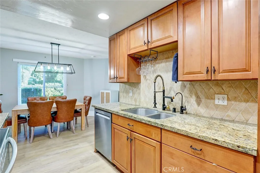 Located in the highly sought-after community of Faire Harbour, this beautifully updated home features 3 bedrooms and 2.5 baths. The interior has been thoughtfully remodeled with vinyl flooring throughout, upgraded bathrooms, recessed lighting, and more. The kitchen offers a breakfast nook, honey maple cabinetry, tumbled travertine backsplash, granite countertops, dual sink, and a view of the surrounding greenbelt. A pocket door connects the kitchen to the dining room and opens to the inviting family room, which features a fireplace and abundant natural light. Sliding doors lead to the fenced patio, which opens directly to a large, park-like grass patch and lush greenbelt—ideal for outdoor dining, entertaining, pets, or play. Upstairs, the primary suite boasts a peek ocean view, en-suite bath with skylight, separate vanity area, and a walk-in closet. Two additional bedrooms share a full bath; one offers a walk-in closet and the other features a window seat overlooking the greenbelt. The laundry closet is also located upstairs and accommodates full-size units. Thoughtful craftsmanship can be seen throughout the home, including upgraded baseboards, window trim, a modern stair rail recently installed. Energy-efficient double-paned Milgard windows enhance comfort and efficiency year-round. Additional highlights include a whole-house re-pipe, central heating, a detached 2-car garage with built-in storage. Community amenities include a fenced pool, spa, and volleyball court. Faire Harbour is ideally situated near top schools, local beaches, grocery stores, restaurants, the outlet mall, and freeway access. The HOA covers water, adding extra value and convenience for homeowners.