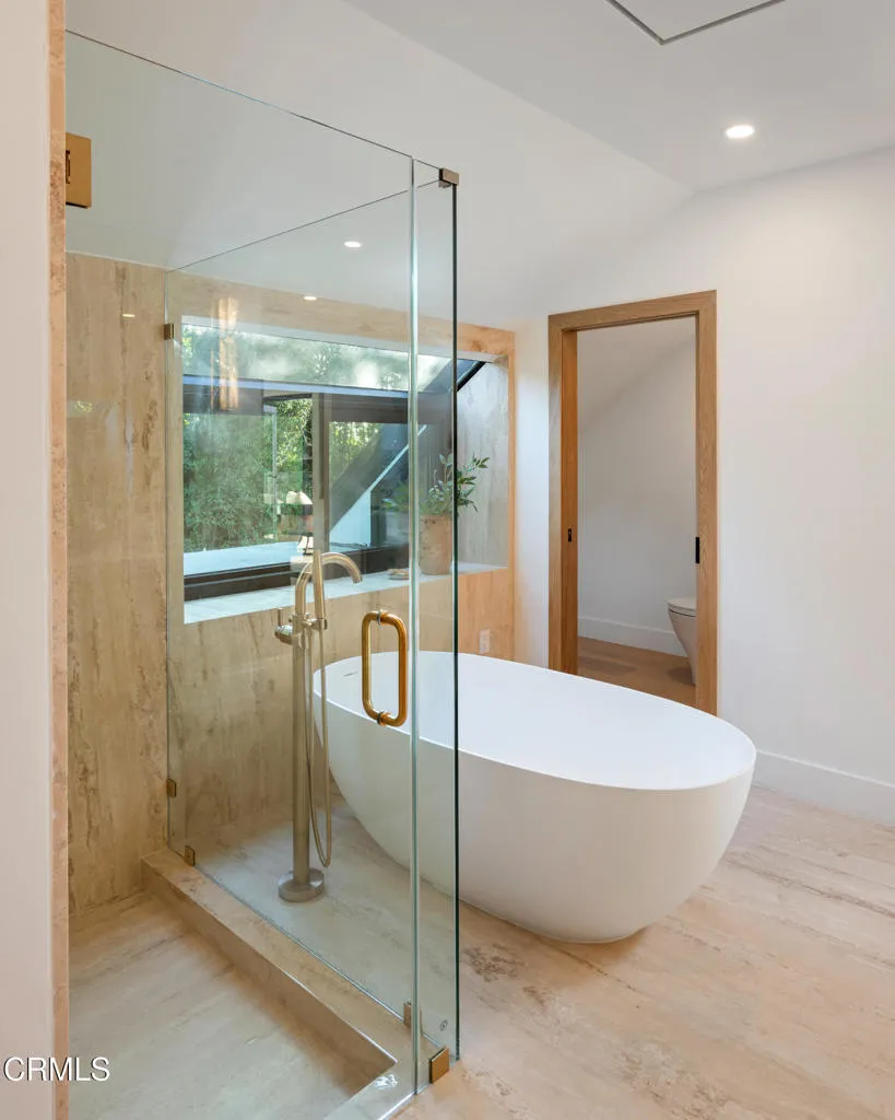 Tucked behind a long private driveway and secured by double gates, this newly renovated residence offers exceptional privacy and tranquility within the exclusive gated enclave of Oak Pass Road--an intimate Beverly Hills community celebrated for its serene setting and notable celebrity residents.Surrounded by mature landscaping and natural canyon beauty, the 4,000+ square-foot home is a peaceful retreat just minutes from the world-class shopping, dining, and lifestyle offerings of Beverly Hills. The main level welcomes you through a striking grand pivot entry door into an open, light-filled floor plan designed for gracious living and entertaining. Architectural highlights include vaulted ceilings, a central fireplace, refined custom details, wide-plank French oak flooring, and designer Spanish alabaster lighting throughout.The expansive chef's kitchen seamlessly blends elegance and functionality, showcasing striking Taj Mahal marble countertops, a center island, breakfast nook, abundant storage, and top-of-the-line Miele and Viking appliances--ideal for both everyday living and effortless entertaining.The upper level is dedicated entirely to the primary suite, a private sanctuary complete with a fireplace, balcony, walk-in closet with custom built-ins, and a spa-inspired ensuite bathroom adorned with full-slab travertine stone finishes.The lower level offers a spacious entertaining lounge with direct access to the pool and outdoor living areas, creating a seamless indoor-outdoor experience. The backyard is framed by sleek glass railings that preserve unobstructed canyon views, enhancing the sense of openness and connection to the surrounding landscape. With a private entrance, this level also includes a versatile bonus room with an adjacent bathroom--perfect for use as an additional bedroom, gym, studio, playroom, or home theater.Set within one of Beverly Hills' most coveted and tranquil gated communities, this turnkey five-bedroom, four-bathroom residence delivers a rare blend of privacy, scenic canyon surroundings, and proximity to city amenities--an exceptional opportunity to own a newly renovated home offering gated seclusion, captivating views, and an elevated outdoor lifestyle.