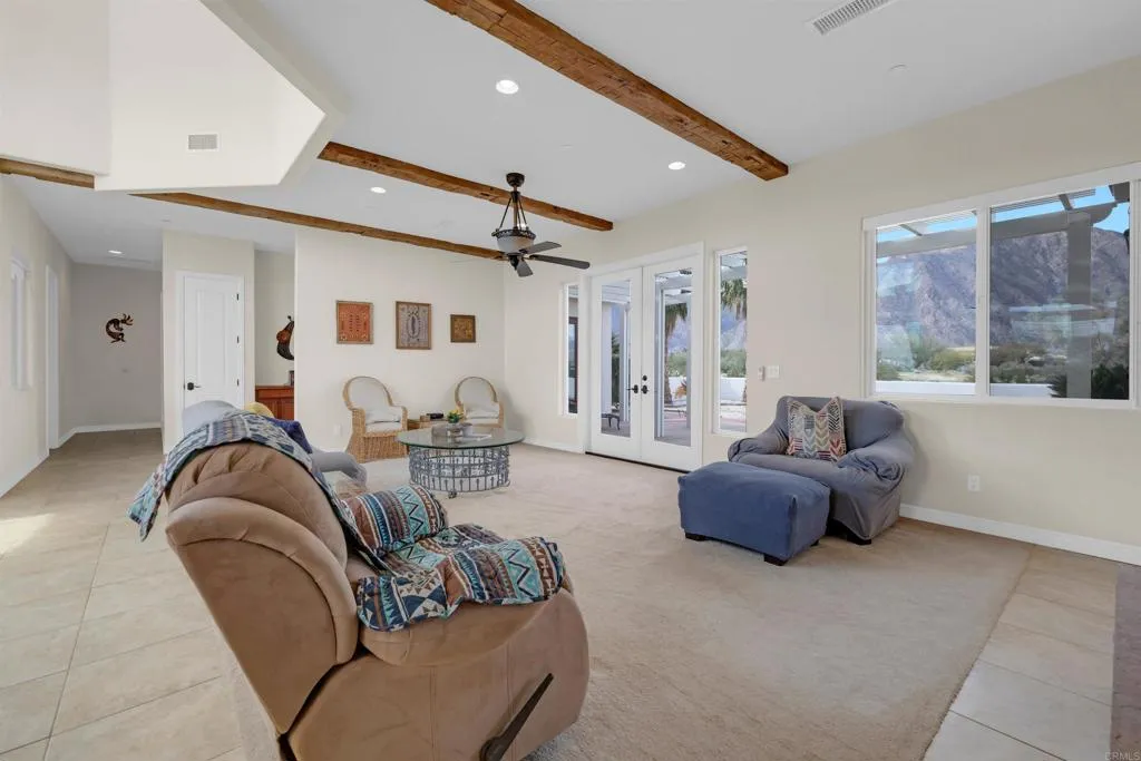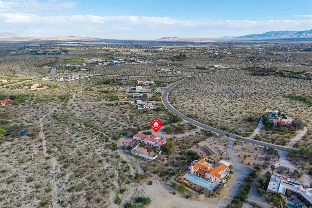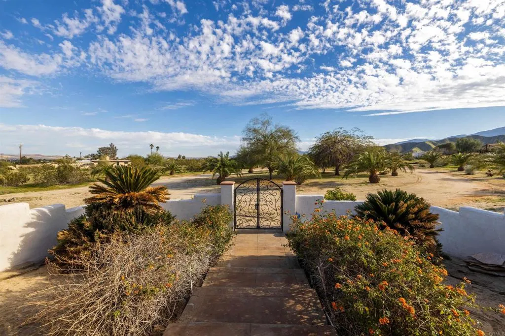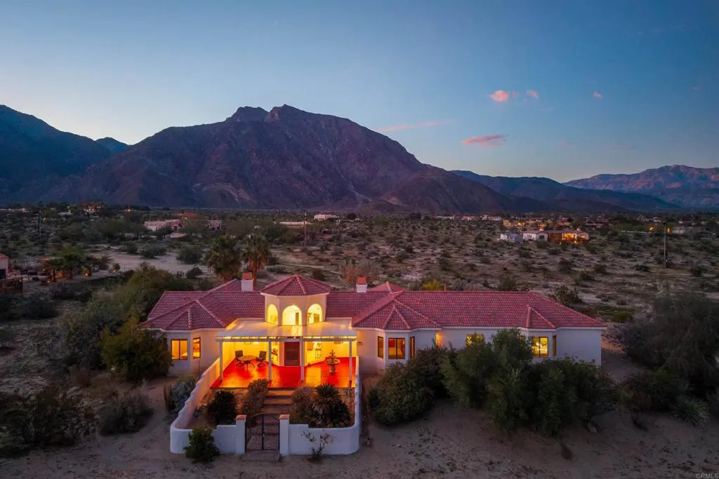 Spectacular views and nestled against the breathtaking Indian Head Mountain in one of the most desirable residential areas of Borrego Springs, this custom-built home offers refined desert living at its best. Spanning 2,565 square feet, this luxurious 3-bedroom, 2.5-bath home combines modern amenities with timeless charm. Situated on a sprawling 2.5-acre lot, there’s ample room to create your own private oasis, including space for a pool with utilities. Upon entering through the walled front courtyard, you’re greeted by soaring 10' ceilings and elegant 8' doors that create an open, spacious feel. A formal entry leads to the living and family rooms, where a two-sided propane fireplace exudes warmth and comfort. The chef’s kitchen is a culinary delight, featuring a Monogram built-in refrigerator, propane stove, Bosch dishwasher, and a walk-in pantry. The primary suite boasts a fireplace, a luxurious en-suite with a jacuzzi tub, and beautiful desert views. Additional highlights include two HVAC systems with WiFi controls, a laundry room conveniently located near the kitchen, an oversized attached two-car garage, and a walled back patio with a fire pit for private outdoor gatherings. Landscaping is on automatic irrigation, ensuring easy maintenance. Borrego Springs offers a serene lifestyle, where stargazing, hiking, and outdoor adventures abound. As an International Dark Sky Community surrounded by the stunning Anza-Borrego Desert State Park, this peaceful village promises a truly unique desert retreat. Discover the unmatched beauty and tranquility of Borrego Springs—your desert haven awaits.