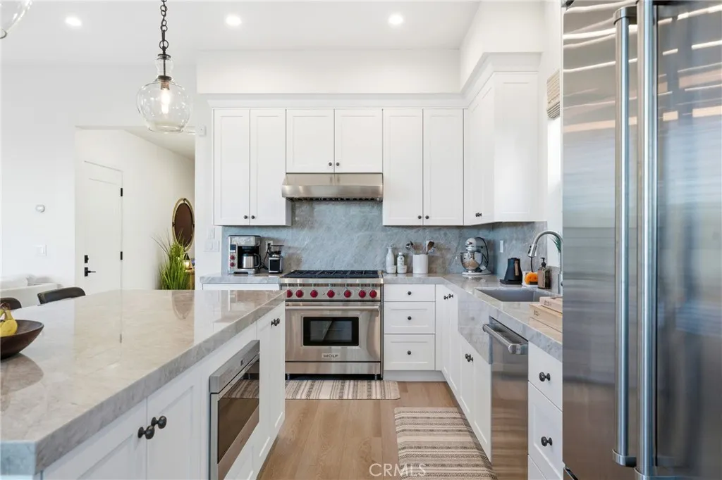 Welcome to 109 Fairgreen, Irvine—where elevated design and effortless California living come together in one of the city’s most peaceful and sought-after neighborhoods. Located within the award-winning Irvine Unified School District and just moments from parks, resort-style pools, and scenic trails, this exceptionally quiet community offers the perfect blend of luxury, comfort, and location. Inside, the home is highlighted by wide-plank laminate flooring, recessed lighting, plantation shutters, custom designer drapery, a custom stair runner that adds warmth and texture, and upgraded fixtures and hardware throughout. The gourmet kitchen is a true centerpiece, showcasing Taj Mahal quartzite countertops that seamlessly extend across the kitchen counters, backsplash, and into the bathrooms, paired with high-end Wolf appliances, a 36-inch Sub-Zero refrigerator, and refined cabinetry for a timeless, designer look. Upstairs, the spa-inspired primary suite features a newly tiled shower, designer-selected tile flooring, and elegant designer wallpaper, creating a serene retreat, while the secondary bathrooms mirror this elevated aesthetic with coordinating tile finishes and designer wallpaper for a cohesive, luxury feel. Expansive panoramic sliding doors invite seamless indoor-outdoor living and open to a private, professionally landscaped backyard with no neighbors to the north and sweeping mountain views overlooking Tomato Springs Park. Additional highlights include a finished garage with epoxy floors, Tesla charger, overhead storage, full interior insulation, a car charger outlet, and paid-off solar panels for energy efficiency. Thoughtfully upgraded and beautifully positioned, 109 Fairgreen is a rare opportunity you won’t want to miss.