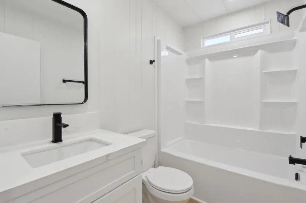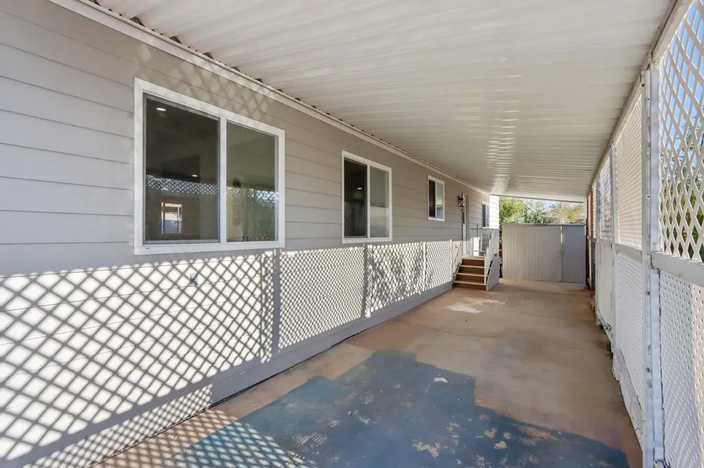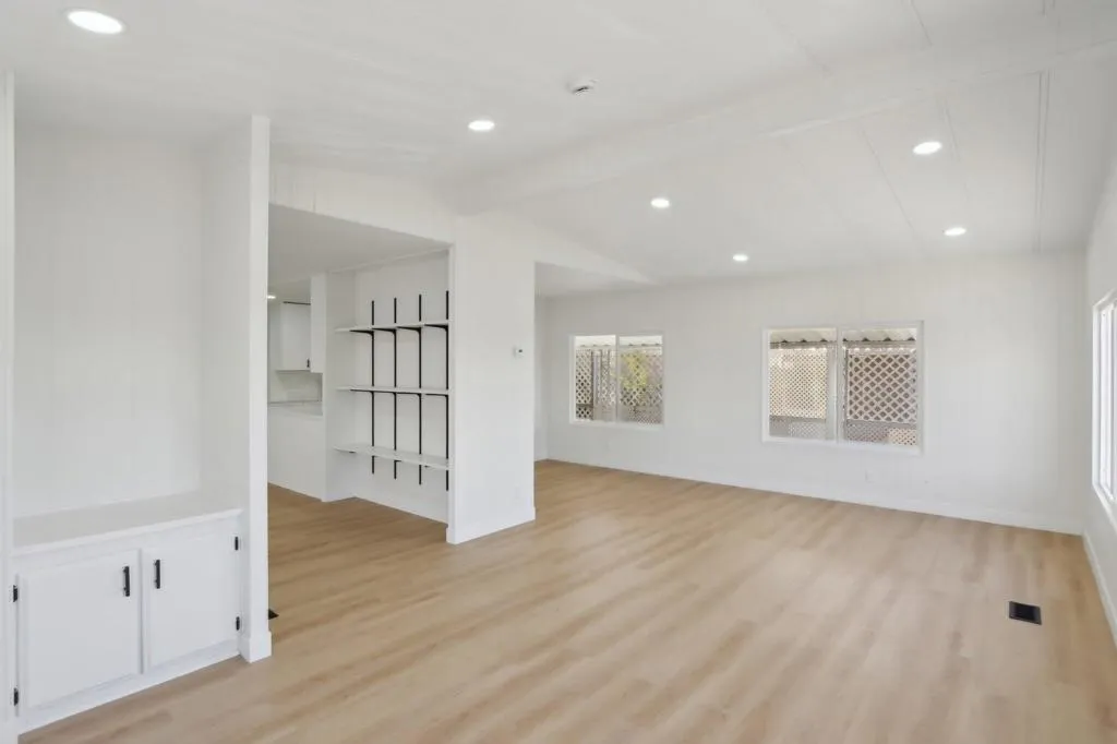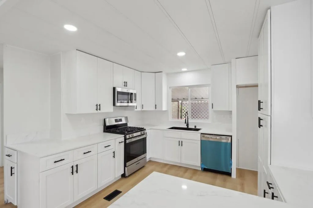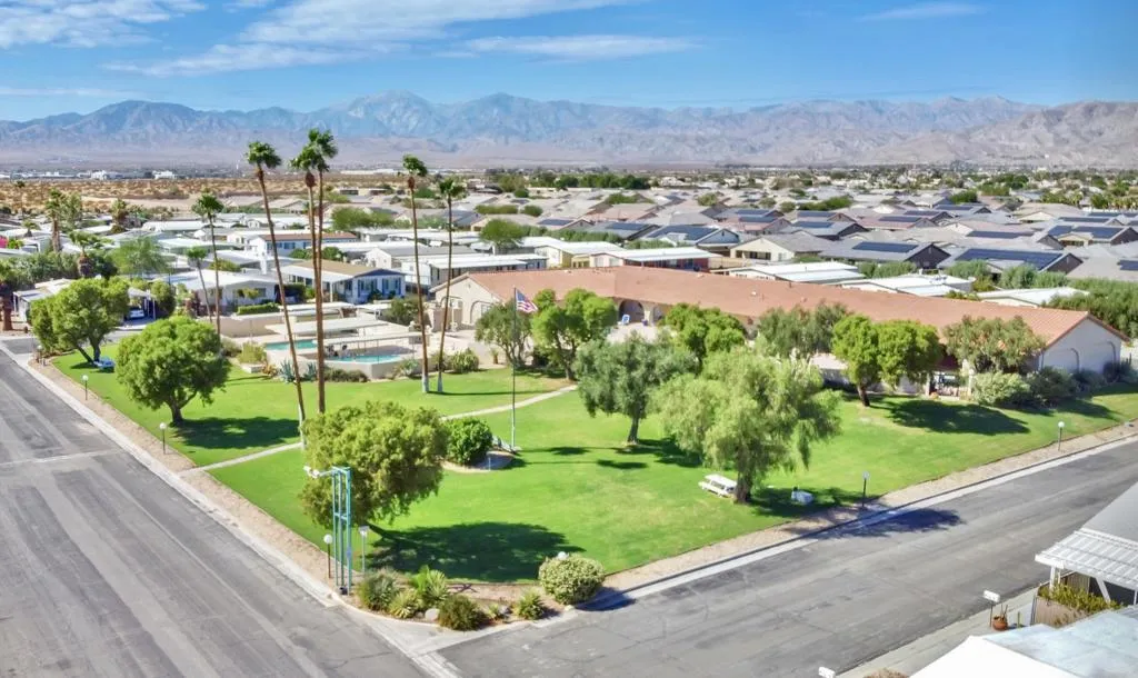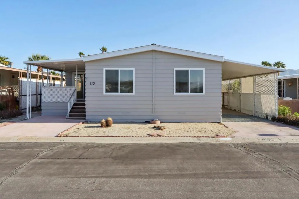 COMPLETE INTERIOR REMODEL! This beautifully reimagined home blends modern upgrades with open, comfortable living. Seller will install 433 - The 433A PERMANENT FOUNDATION enables Conventional, FHA/VA and Reverse Mortgage Financing. The expanded kitchen and vaulted ceilings create a bright, airy feel that connects seamlessly to the family and dining rooms, perfect for both daily living and entertaining. Luxury vinyl flooring, quartz countertops, stainless steel appliances, energy-efficient windows, and recessed lighting are found throughout. From the living room and raised front porch, enjoy sweeping Southwestern mountain views. The chef's kitchen flows to a spacious family room with slider access to the front patio, while the dining room offers built-in cabinetry for added storage and display. The primary suite features a spa-inspired bath with shower stall, free-standing soaking tub, and generous vanity space. The laundry room is designed for convenience with a sink and extensive cupboard storage. Sky's Haven is one of Desert Hot Springs' premier 55+ gated communities, featuring three pools, spa, clubhouse, fitness center, sauna, billiards, and park area, along with a full calendar of social and recreational activities. Best of all, you OWN THE LAND with low HOA dues, and all utilities are billed through the HOA. Ideally located just 15 minutes from Palm Springs and 20 minutes from Morongo Casino Resort & Spa in Cabazon, this home offers both comfort and lifestyle in a highly desirable setting.