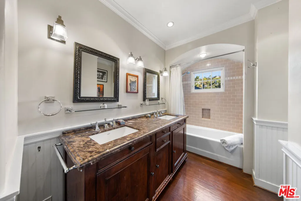 Spanish Cottage with professionally landscaped yard. Available for lease in the prestigious Bronson Canyon neighborhood. Enjoy classic architectural detail elevating the design of the home thorughout. Warm and welcoming living areas with arched doorways, hardwood floors, a pitched ceiling, and a cozy decorative fireplace. The kitchen caters to those who. like to cook. Fully renovated with custom millwork, stone countertops, and new high-efficiency appliances. The primary suite has a dual closet system, french windows looking out to the Hollywood Hills and a spa like bath featuring a custom double marble vanity, mission-style subway tile, and a deep porcelain soaking tub. The home has a second main floor bedroom that can serve as an office or den. And, there is a third bedroom down stairs with an ensuite bath and private entry. California is known for its indoor-outdoor living and this home does not disappoint. A tranquil backyard porch and pergola for morning coffee, complemented by updated landscaping, exterior lighting, and a coveted third parking space. We invite you to do more than just tour the house, come and experience the local lifestyle before you sign. Take a "test drive" of the neighborhood by starting your morning with a latte at the nearby Oaks Gourmet, or fresh juice at Kreation. Exploring the iconic Griffith Park just minutes away, or enjoying a sunset dinner at the trendy shops and restaurants of Franklin Village. Don't miss this rare opportunity to lease an extraordinary home in one of the most serene yet accessible enclaves of the Hollywood Hills.