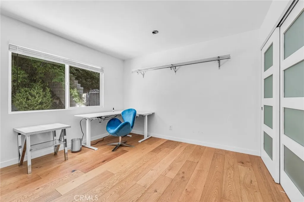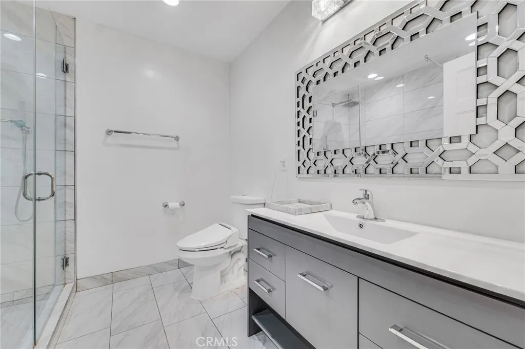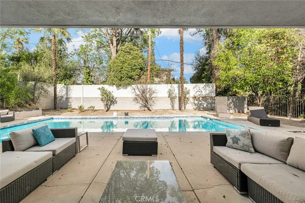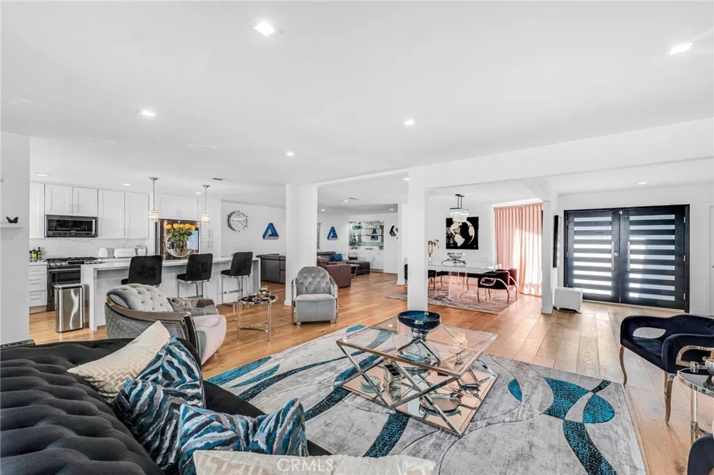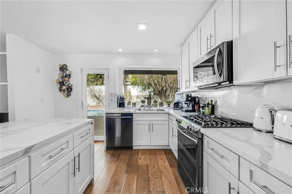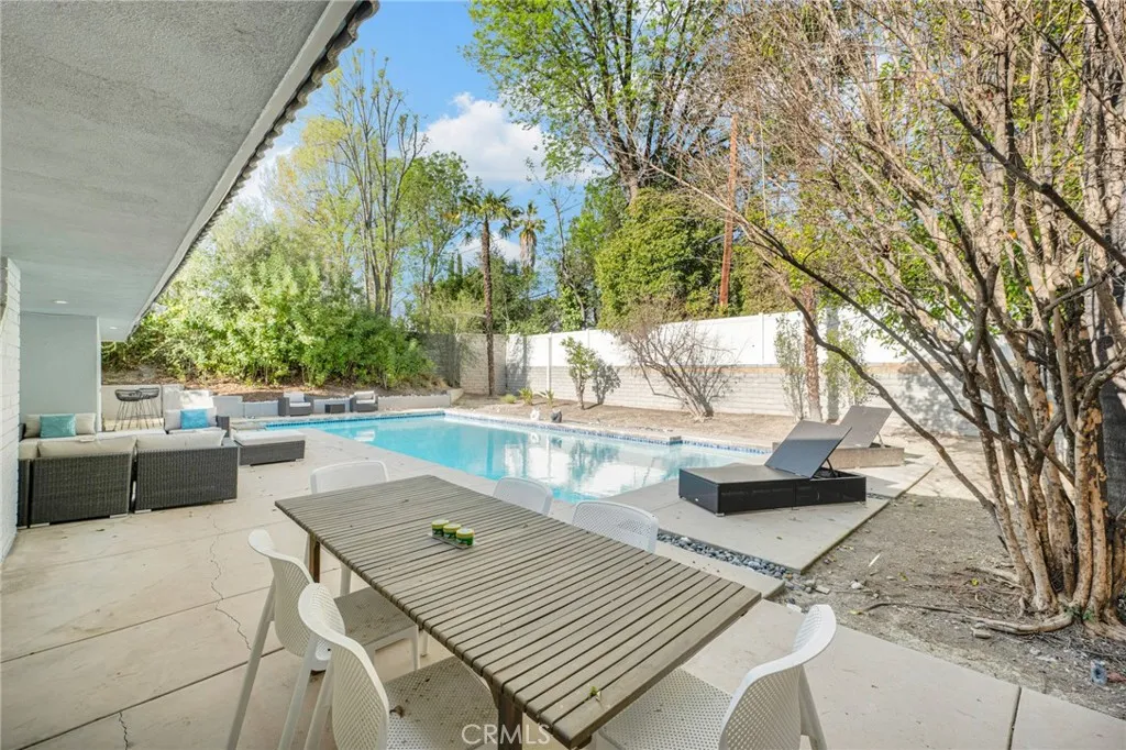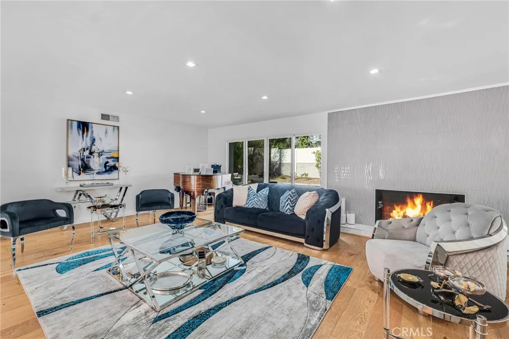 Discover this luxury and modern elegance in this newly remodeled Hidden Estates home. The open floor plan is bathed in natural light through wraparound windows and dual-pane sliding doors. At its heart, a striking metallic porcelain fireplace complements the designer kitchen, featuring Calacatta quartz countertops, self-closing cabinetry, stainless steel appliances, and a Samsung Smart Fridge. A spacious breakfast counter and formal dining room with pool views make entertaining effortless. Hardwood floors and LED recessed lighting enhance the sophisticated ambiance. The primary suite offers a walk-in closet, backyard access, and a spa-like bath with a temperature-controlled shower, soaking tub, dual vanities, and quartz countertops. Three additional bedrooms feature custom closets and stylish window treatments, while a high-tech bidet/toilet elevates the hall bath. The tranquil backyard boasts a sparkling swimmer’s pool with new tiling and a spacious BBQ area. A voice-controlled Vivint Smart Home System manages security, climate, and entry locks. Located adjacent to Hidden Hills, this home is within the Lockhurst Elementary, Hale Middle, and El Camino Real High charter school district and just minutes from The Commons at Calabasas.