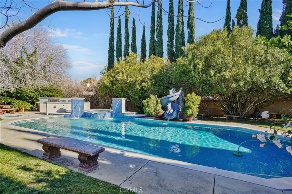 Entertain year-round in the Resort-style Sparkling Pool & Spa with Waterfall features and and a Waterslide. This Backyard is Designed for both Relaxation and Entertaining. Several Expansive Patio areas, Lush Landscaping, a Built-in BBQ, and Decorative Lighting, a True Private Oasis.