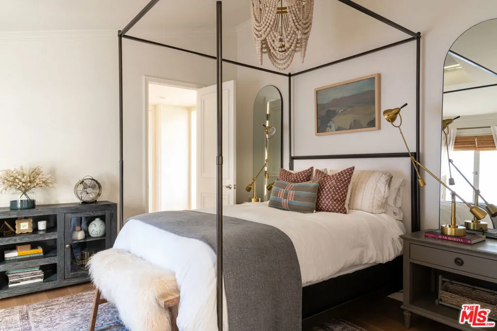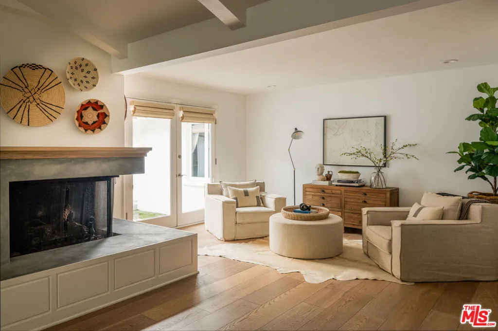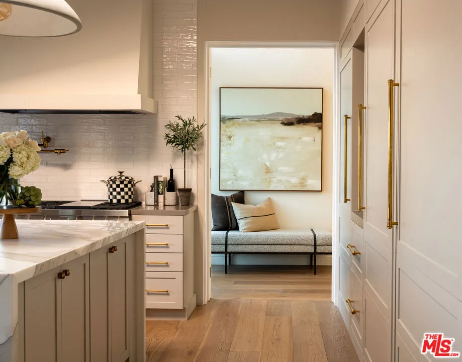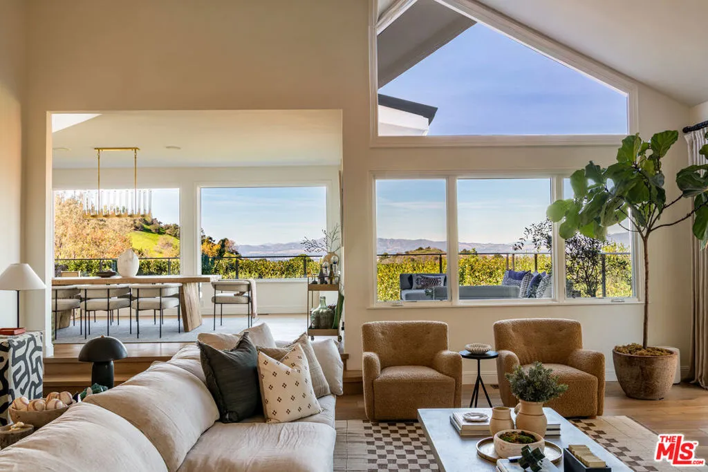 Tucked behind the gates of The Summit, one of Beverly Hills Post Office's most exclusive enclaves, this quietly spectacular residence feels like a private resort perched above the city. Thoughtfully redesigned with an eye toward serenity and elevated California living, the home unfolds with soft natural light, generous scale, and seamless indoor-outdoor connection. The main living spaces capture panoramic canyon views, drawing your eye across treetops and evening sunsets. A soothing palette of warm woods, layered textures, and sculptural lighting creates an atmosphere that is both refined and deeply inviting. The kitchen, bright, airy, and beautifully appointed, features Calacatta Gold marble counters, unlacquered brass hardware from Rejuvenation, open shelving, and a sun-washed dining nook. It's a space that celebrates the simple joy of gathering, cooking, and lingering. The backyard is its own sanctuary: a resort-style pool framed by lush landscaping, multiple lounge terraces, and intimate moments of designcascading greenery, and a tree canopy draped in twinkle lights. It's a setting that feels worlds away, perfect for long summer afternoons or hosting unforgettable evenings. The private rooms continue the sense of calm. The spacious primary suite features vaulted, beamed ceilings, garden views, and a cozy sitting area that turns morning coffee into a ritual. A moody, bespoke office offers an entirely different energytailored, architectural, and ideal for focus. Every corner of this home has been considered. Every sightline curated. And every space designed to reflect what life in The Summit is meant to be: elevated, peaceful, timeless.A rare opportunity to own a residence that balances luxury with livabilityhigh design with heart.