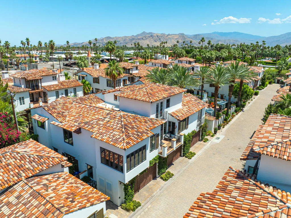 You're sure to be charmed by this recently built Historic Tennis Club home in St. Baristo Villas, where from numerous balconies you see both the City of Palm Springs and Mountains. Owing to its proximity to the exquisite resort-like Baristo Villas pool complex, these views are largely unobstructed. As you enter the front patio framed by Italian cypresses, you arrive into a formal entry where you can use your private elevator or take the elegant staircase leading to the main living area. If entertaining is to your liking, here you find a gourmet kitchen with sizable terrace, a breakfast area, and grand living room with adjoining dining area, all connected and on one floor. The kitchen boasts premium Viking appliances, handsome cabinetry, and a convenient island with bar seating-perfect for casual meals or entertaining guests. On the penthouse level, you enjoy a private balcony and a luxurious ensuite with double sized shower and bench. On the main level, guests will appreciate their own private retreat with oversized shower & standalone tub with window overlooking the pool.The superb location places you just steps from downtown Palm Springs' vibrant attractions, including the Palm Springs Art Museum and Forever Marilyn statue. After exploring the city, return home to relax by the beautiful resort-like pool, visible from your residence. This property offers the option to purchase the playful, colorful furnishings outside of escrow, allowing you to move in and immediately embrace the Palm Springs lifestyle.