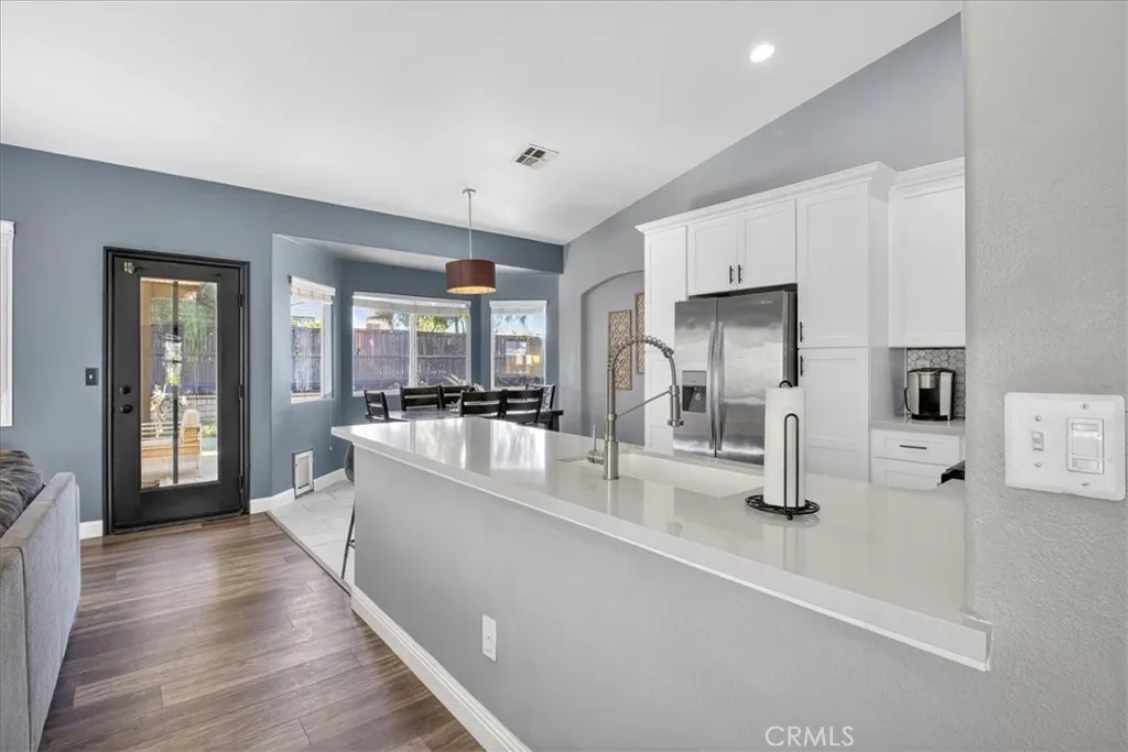 Welcome Home! 26637 Trumble Road is a beautifully upgraded, move in ready home located in the heart of Menifee. This residence offers 1,585 square feet of living space on a spacious 7,405-foot lot. Blending modern updates with everyday comfort and functionality, this home provides the perfect setting for relaxed living and entertaining. Step inside to discover luxury vinyl plank flooring throughout, creating a seamless, stylish, and low-maintenance interior. The fully upgraded kitchen showcases quartz countertops, custom cabinetry, and updated appliances, making it ideal for both daily living and entertaining. Quartz surfaces extend into the bathrooms, where upgraded tile work adds a clean, contemporary feel. This home truly stands out with custom cabinetry in the kitchen, bathrooms, laundry room, and hallway, offering abundant storage and a refined, high-end aesthetic throughout. Additional upgrades include a tankless water heater for energy efficiency and on-demand hot water, EV charging for future-ready convenience, and an epoxy-coated garage floor, adding both durability and a polished, finished look to the garage space. The backyard is designed for easy enjoyment, featuring a covered patio and ample space for relaxing, entertaining, or outdoor dining—perfect for enjoying Southern California’s year-round mild climate. With extensive upgrades already completed, this home is truly move-in ready and ideal for buyers seeking a low-maintenance, modernized property. Located in the growing and highly desirable city of Menifee, residents enjoy access to parks, shopping centers, dining, schools, and community amenities, all while maintaining a relaxed suburban atmosphere. Quick and convenient access to the I-215 Freeway makes commuting to surrounding cities, employment hubs, and destinations throughout Southern California a breeze. 26637 Trumble Road offers the perfect combination of upgrades, location, and lifestyle—an exceptional opportunity in one of Menifee’s established neighborhoods.