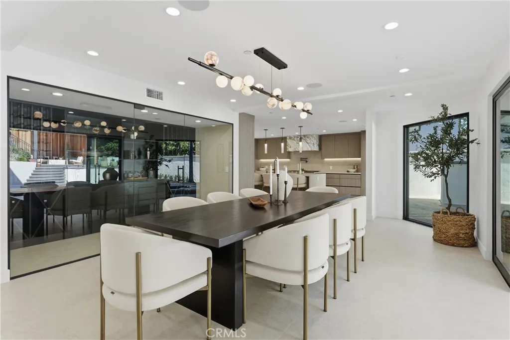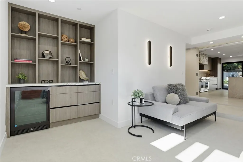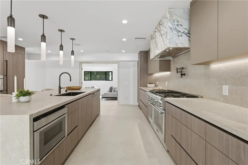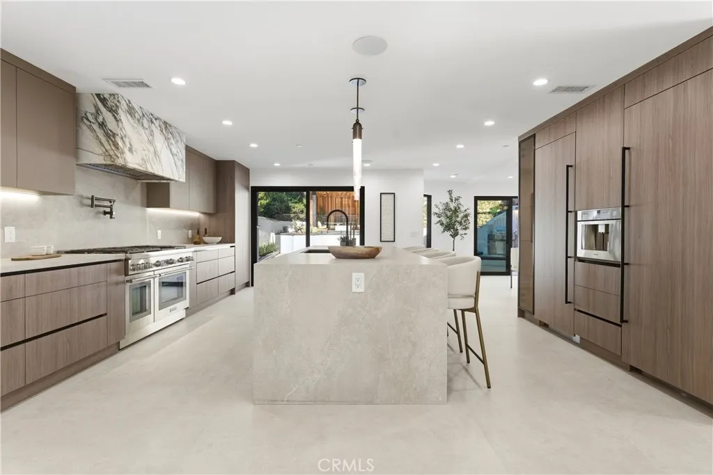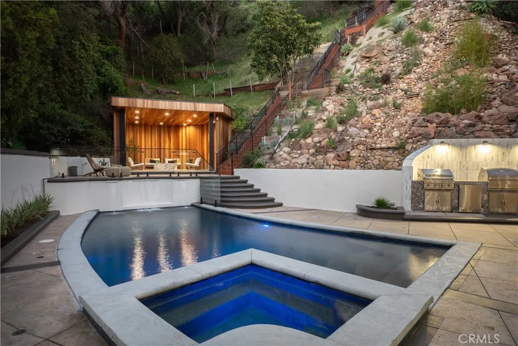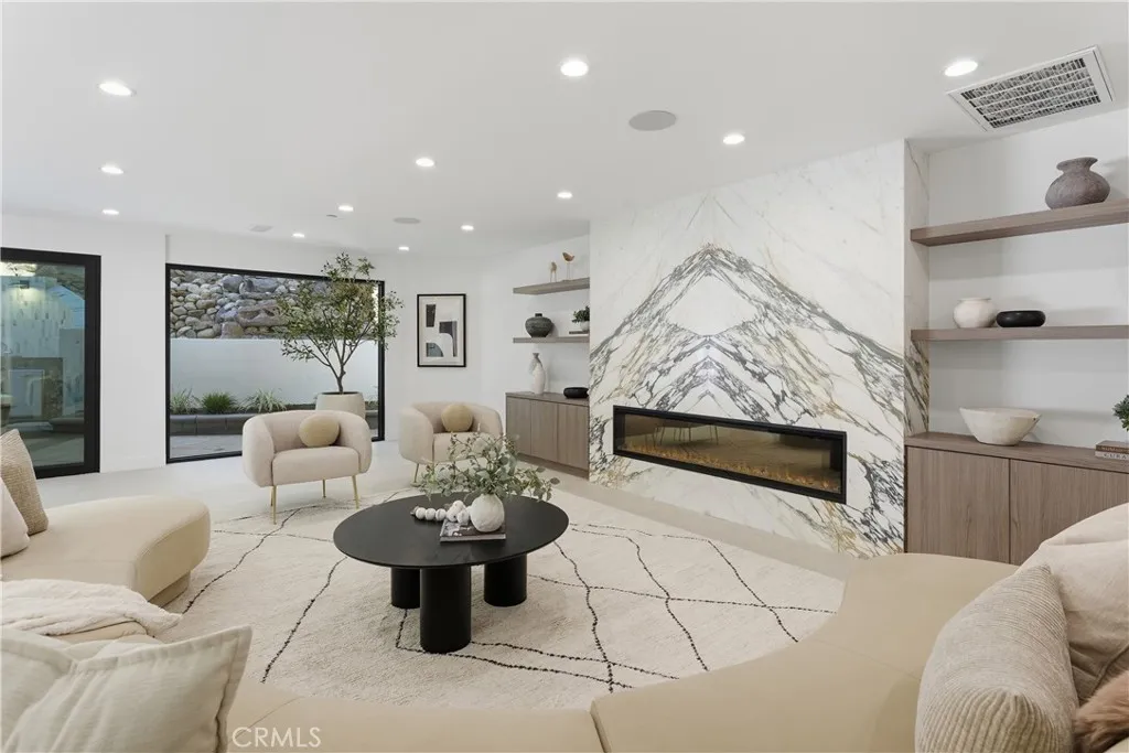 Perched in the coveted Hollywood Hills, this newly reimagined modern home is a striking expression of luxury, design, and harmony with nature. Thoughtfully crafted to elevate everyday living, the residence offers an exceptional indoor-outdoor lifestyle moments from the Sunset Strip and Los Angeles’ most celebrated dining and nightlife. Spanning six bedrooms and six and a half bathrooms, the home welcomes you with a dramatic open-concept floor plan defined by great spaces and impeccable finishes. The main level showcases oversized 60x60 Italian tile flooring and custom European flat-panel cabinetry throughout. The living room is anchored by a breathtaking Calacatta marble fireplace that flows seamlessly into the dining area and a custom-built wine room ideal for entertaining. The state-of-the-art chef’s kitchen blends form and function with Italian porcelain slabs wrapping the oversized island, cabinetry, and backsplash, complemented by Graff fixtures and a Calacatta marble hood. Thermador appliances include a built-in refrigerator, precision coffee system, six-burner range with double oven, dishwasher, and micro-drawer microwave. Custom lighting enhances every detail. A curved staircase illuminated by lighting leads to the private living quarters. The expansive primary suite is a serene retreat, framed by oversized picture windows that invite the surrounding landscape indoors. Custom cabinetry, an oversized walk-in closet, and a spa-inspired bathroom complete the experience. The primary bath features dual vanities topped with Calacatta marble, premium fixtures, a freestanding soaking tub, and a generous walk-in shower with built-in steam, all bathed in natural light. Additional four ensuite bedrooms continue the home’s refined aesthetic with curated designer finishes.The lower level offers a versatile sixth bedroom currently configured as a media room, ideal for a family lounge or executive office, complete with an ensuite bathroom and custom built-in cabinetry with refrigerator. Bathrooms throughout the residence showcase Porcelanosa wall and floor tiles, custom vanities, LED mirrors, and high-end fixtures. Fleetwood sliding glass doors open to a private resort-style oasis with a smart pool and spa, outdoor kitchen with dual grills including charcoal, a cabana, and stairs leading to an elevated overlook deck with sweeping views. This Hollywood Hills retreat is a rare offering, blending architectural elegance, modern luxury, and an unparalleled location.