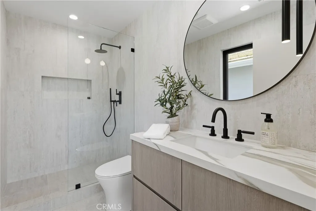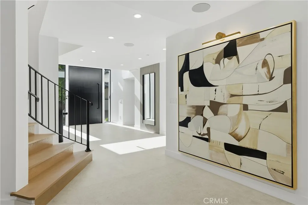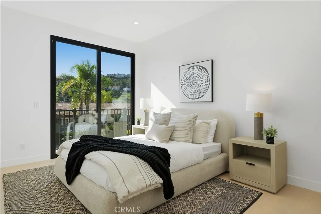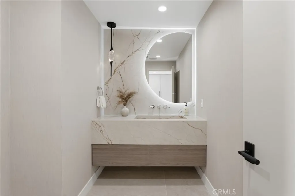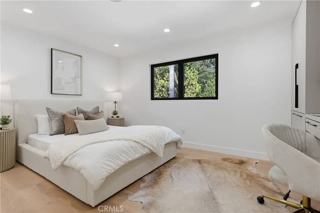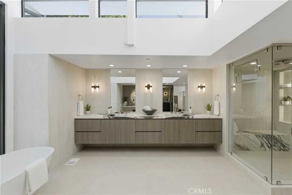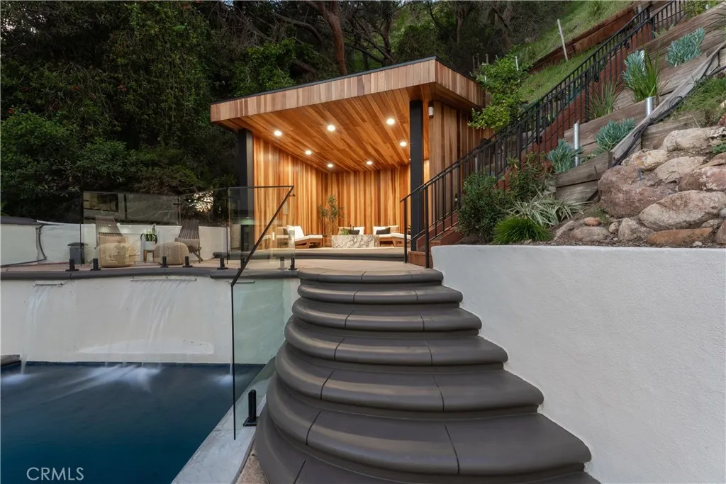 Perched in the coveted Hollywood Hills, this newly reimagined modern home is a striking expression of luxury, design, and harmony with nature. Thoughtfully crafted to elevate everyday living, the residence offers an exceptional indoor-outdoor lifestyle moments from the Sunset Strip and Los Angeles’ most celebrated dining and nightlife. Spanning six bedrooms and six and a half bathrooms, the home welcomes you with a dramatic open-concept floor plan defined by great spaces and impeccable finishes. The main level showcases oversized 60x60 Italian tile flooring and custom European flat-panel cabinetry throughout. The living room is anchored by a breathtaking Calacatta marble fireplace that flows seamlessly into the dining area and a custom-built wine room ideal for entertaining. The state-of-the-art chef’s kitchen blends form and function with Italian porcelain slabs wrapping the oversized island, cabinetry, and backsplash, complemented by Graff fixtures and a Calacatta marble hood. Thermador appliances include a built-in refrigerator, precision coffee system, six-burner range with double oven, dishwasher, and micro-drawer microwave. Custom lighting enhances every detail. A curved staircase illuminated by lighting leads to the private living quarters. The expansive primary suite is a serene retreat, framed by oversized picture windows that invite the surrounding landscape indoors. Custom cabinetry, an oversized walk-in closet, and a spa-inspired bathroom complete the experience. The primary bath features dual vanities topped with Calacatta marble, premium fixtures, a freestanding soaking tub, and a generous walk-in shower with built-in steam, all bathed in natural light. Additional four ensuite bedrooms continue the home’s refined aesthetic with curated designer finishes.The lower level offers a versatile sixth bedroom currently configured as a media room, ideal for a family lounge or executive office, complete with an ensuite bathroom and custom built-in cabinetry with refrigerator. Bathrooms throughout the residence showcase Porcelanosa wall and floor tiles, custom vanities, LED mirrors, and high-end fixtures. Fleetwood sliding glass doors open to a private resort-style oasis with a smart pool and spa, outdoor kitchen with dual grills including charcoal, a cabana, and stairs leading to an elevated overlook deck with sweeping views. This Hollywood Hills retreat is a rare offering, blending architectural elegance, modern luxury, and an unparalleled location.