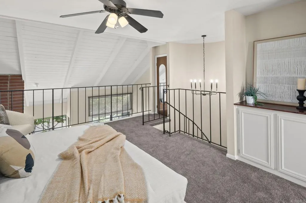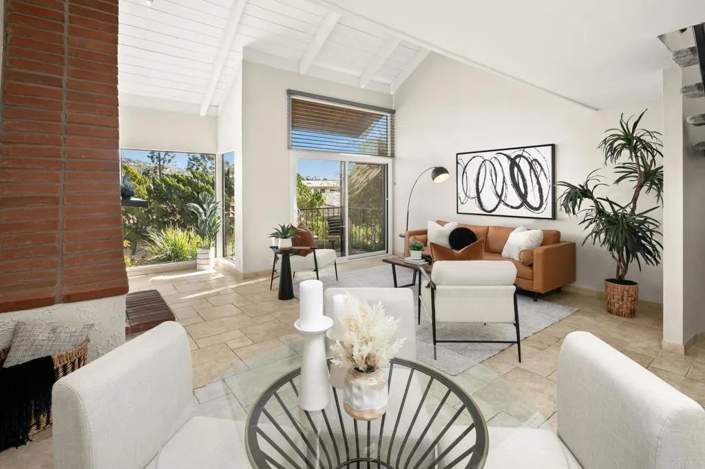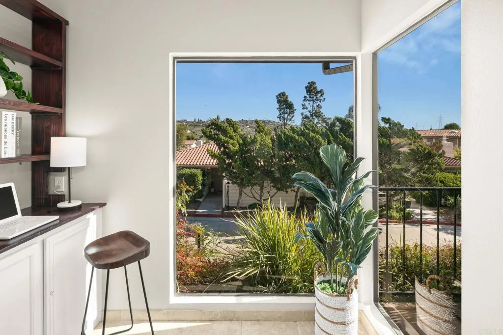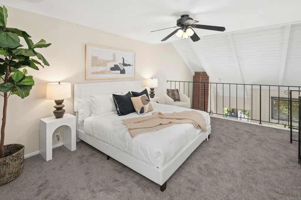 Welcome to the serene and inviting Casitas De La Costa community, nestled in the heart of La Costa. This spacious two story, end-unit, loft-style home, thoughtfully designed and newly refreshed with new carpet, new paint throughout, new bathroom fixtures, new granite countertops and sinks in the baths and a walk-in closet. The kitchen boasts, recessed lighting, a new stove, freshly painted cabinets and a big stainless steel refrigerator. The oversized vaulted ceilings give the home an expansive feeling with gorgeous views looking east from the patio and picture window. This home has beautiful tile floors, a wood burning fireplace and exudes warmth and character. Enjoy the private patio or unwind in the community’s two pools, two spas, two saunas, and resort like feel with the sounds of the water features flowing throughout the community. The home has stackable washer and dryer, 1 gated assigned covered parking, underground parking for visitors and is a short drive to the ocean, state beaches, Batiquitos Lagoon and is very close to Omni La Costa Resort, for shopping, dining and golf. Stores, cinemas, restaurants and more are walkable, not to mention Carlsbad Schools are highly sought after. This home is a true retreat ready for it's next homeowner!