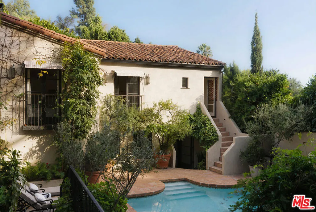Spanish-style 1930s Hollywood hideaway on lower Queens Road, offering exceptional privacy with celebrity pedigree. Meticulously restored residence with vaulted living room and fireplace, formal dining room, and library/media room with custom cabinetry. Chef's kitchen features marble countertops, hand-painted tile backsplash, Viking ovens, and Sub-Zero refrigerator. Reading room leads to the primary suite with Juliet balcony, fireplace, and spa-like bathroom. The guest bedroom with its ensuite bathroom, located on the main level, is a quiet haven with garden views. The expansive, flat backyard is perfect for entertaining, featuring a large pool, integrated spa, built-in BBQ, and multiple seating areas. Lush, layered landscaping with citrus, olive, and palm trees creates a serene and private Spanish-inspired oasis. A separate pool-level guesthouse with bedroom, full bath, and kitchen creates an intimate, private hideaway.