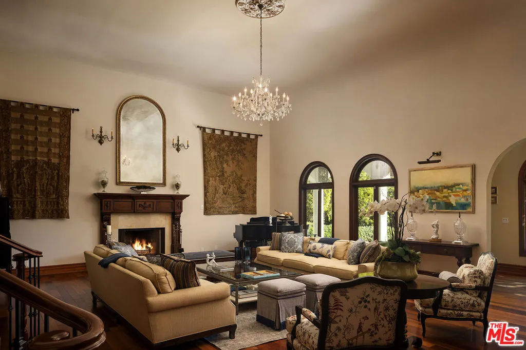 Presenting an exceptionally renovated, move-in-ready 1920s estate on two-thirds of an acre in coveted Hancock Park, offering manicured, tranquil grounds enveloped by lush landscaping and pristine gardens with a variety of indoor and outdoor spaces to roam, relax, and entertain. Classic charm abounds throughout this peaceful entertainer's manse with fine finishes and premier amenities so characteristic of this distinctive, storied enclave near the Wilshire Country Club and Larchmont Village. Set behind privacy gates with an expansive motor court and circular drive, this legacy property underwent an extensive restoration by its present owners, preserving its rich architectural importance and heritage. A festooned porte-cochere proceeds to the home's enchanting portico for receiving guests. Inside, rich hardwood floors flow from the formal entrance hall and into the grand formal living room with high ceilings, double staircase, distinctive fireplace, and a series of archways that set the tone for the whole of the residence. Volume abounds throughout. A large family room has French doors that open to the outside, adjacent to the country kitchen with glass-paned cabinetry, center island with pet nook, state-of-the-art appliances including cooktop and warming drawer, and attached mudroom leading to al-fresco dining areas. Nearby, the formal dining room includes temperature-controlled wine storage, and a proper wood-paneled wet bar is configured with a tasting ledge seating three. Lounge or play pool in the billiards room, or work and study in the home office. Upstairs, the owner's wing has a sitting area with traditional fireplace and opens to its own private terrace overlooking the rear grounds. Its en-suite bathroom features a dual-sink vanity with makeup desk and separate tub and shower, and a walk-in closet is appointed with custom built-ins. A beautiful junior primary bedroom includes soaring vaulted ceilings and a fireplace with elegant marble mantle. One of the secondary bedrooms also has its own spacious balcony and opens to a Hollywood-style bathroom, and a flex space can be utilized as a pajama room or second office. There is even a bonus television/card room with a bathroom and dry sauna. Outside, curated park-like grounds offer endless special moments for rejuvenation and hosting numerous party guests in a magical setting. Enjoy an outdoor living room with wood-burning fireplace and motorized patio shades, an outdoor dining room, and sprawling grassy lawn. A European villa-style saltwater pool is pebble-finished and centered by an elegant water feature, the recreational space encircled by diamond pavers, garden vases, and pristine hedges. Other outdoor amenities include a large built-in barbecue, soothing fountain, various outdoor sitting areas, gardens, pathways, and dog run. Relish serenity and peace in this iconic historical neighborhood, the original choice of the city's founders and cherished by Los Angeles royalty for generations.