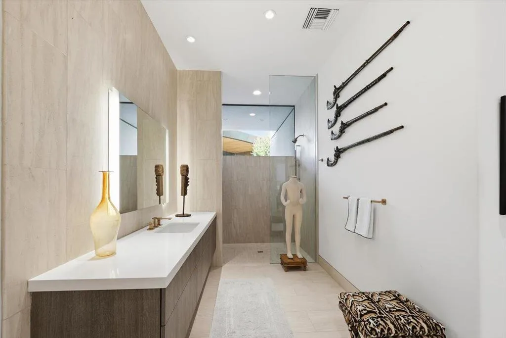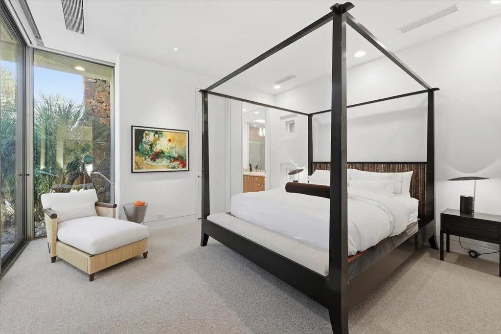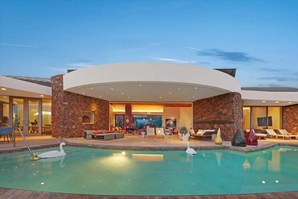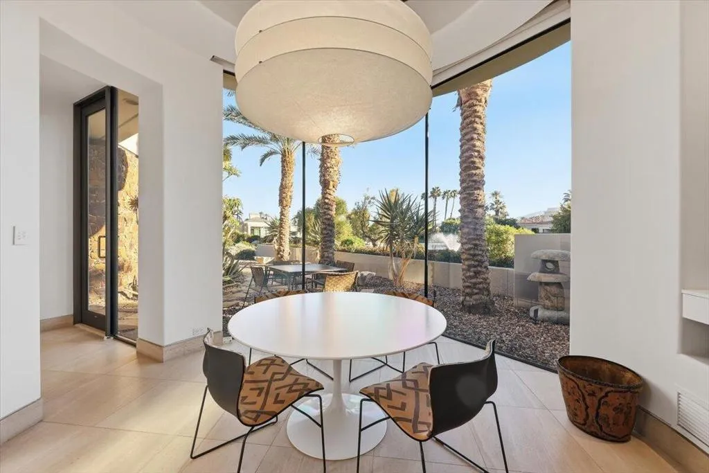 Waterfront Oasis with FULL SOLAR POWER! As the ultimate expression of the world-renowned Rancho Mirage lifestyle, this exceptionally luxurious estate presents a rare opportunity in the intimate guard-gated enclave of Waterford. Crafted by Stoker Builders from a design by visionary architect Narendra Patel, the custom showplace focuses on the relationship between an artistically conceived residence and the landscape that it inhabits. Soaring barrel ceilings trimmed in natural wood planks, white limestone and wide-plank wood floors, and unending walls of floor-to-ceiling windows and doors blend harmoniously with natural light and water views. Bold rock walls hint at the region's famous Mid-Century Modern heritage, while contemporary appointments and carefully integrated updates make this a home for today and long into the future. An expansive single-level floorplan extends approximately 7,374 square feet and reveals five ensuite bedrooms-each with outdoor access, and eight baths. The great room takes center stage, with clerestory windows, a fireplace, 18' ceiling and a vast wall of disappearing glass pockets doors opening to the backyard and pool views. A separate wet bar, large formal dining room with patio, office with built-in cabinetry and desk, and a casual family room flow easily, catering to upscale and low-key entertaining. The estate's curvilinear walls lend visual drama, and nearly every room offers direct access or views to the outdoors. Like the home's baths, its kitchen was completely reimagined from the ground up to create a more cohesive flow throughout. Chefs will appreciate a double-waterfall island with prep sink, frameless white cabinetry with hidden hardware, a skylight, quartz countertops with full backsplash, circular breakfast nook and top-tier Thermador appliances. Rivaling nearby resorts, the primary suite welcomes beautiful views into a private realm enriched with a sitting area, patio, barrel ceiling, two opulent baths and dual walk-in closets. Powered by 100 solar panels, this uncompromising residence continues to impress with a Control4 home automation system, patinaed metal roof, custom lighting and a three-car garage. The homesite is one of the community's largest at approximately 31,799 s.f., providing generous room for a resort pool and spa surrounded by a virtual palm oasis, private patios, and a main patio for entertaining, complete with a high-end outdoor kitchen. Available for only the second time in its storied history.