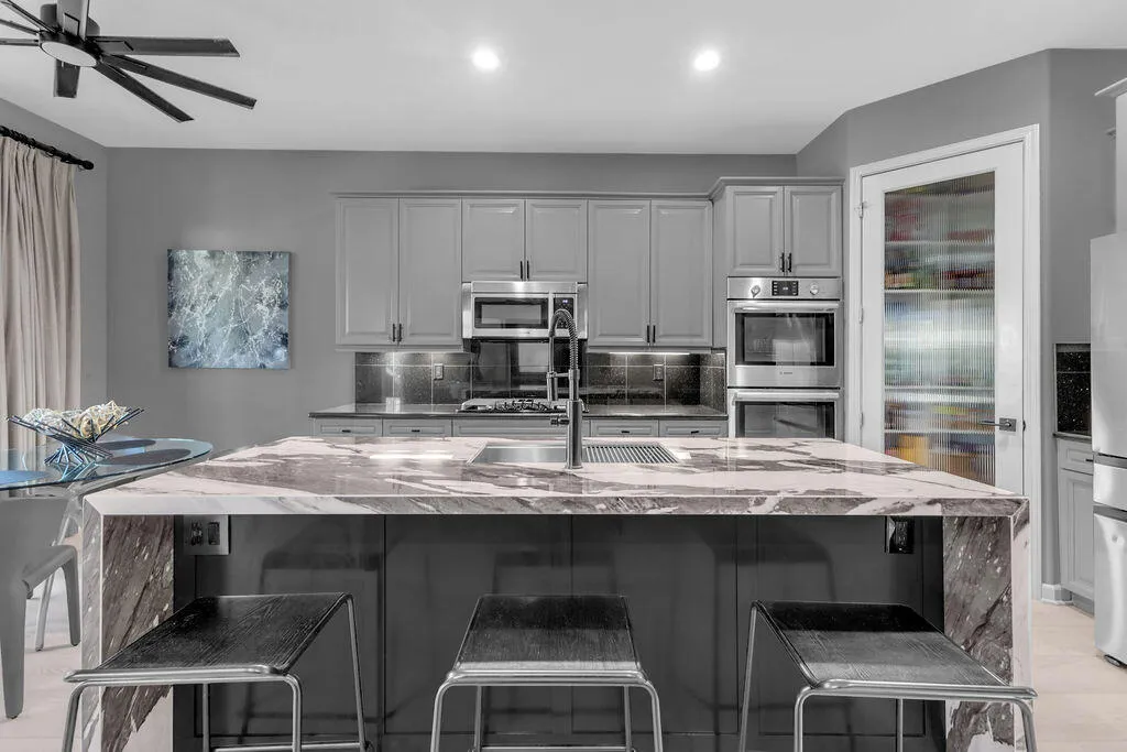 Experience refined desert living at 74080 Portola Pointe Lane, an elegant, thoughtfully upgraded residence nestled in one of Palm Desert's most sought-after communities, where sweeping mountain views set the backdrop for everyday life.Inside, soaring ceilings and an open-concept floor plan create an immediate sense of space and light, enhanced by designer paint tones and sun-drenched interiors throughout. The gourmet kitchen serves as the true heart of the home, anchored by a dramatic waterfall-edge marble island and outfitted with premium stainless steel appliances, double ovens, rich wood cabinetry, and sleek modern black fixtures. The expansive primary suite offers a genuine retreat featuring luxury vinyl plank flooring, generous windows framing the natural landscape, and a spa-inspired ensuite designed to impress.Step outside and the desert lifestyle comes fully to life. A covered patio opens to lush, manicured landscaping and a stunning saltwater pool, all set against a breathtaking mountain backdrop, an entertainer's dream from sunrise to sunset. And with solar fully paid for, you'll enjoy the comfort of resort-style living without the utility costs to match.Beyond the property, you're moments from world-class golf, the iconic El Paseo shopping corridor, and Palm Desert's finest dining and entertainment. Modern sophistication, effortless efficiency, and the very best of desert resort living, all in one exceptional home.
