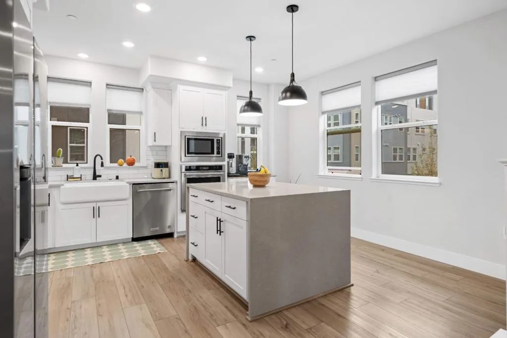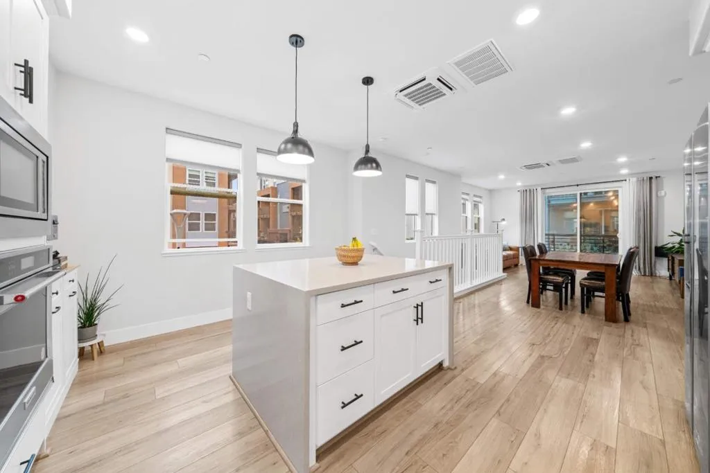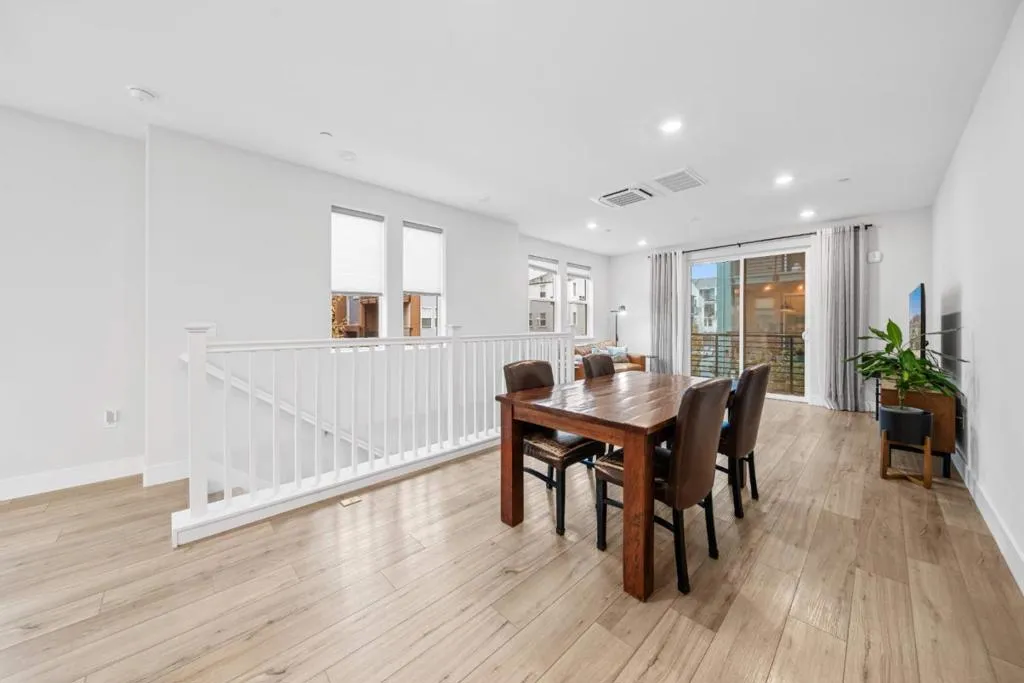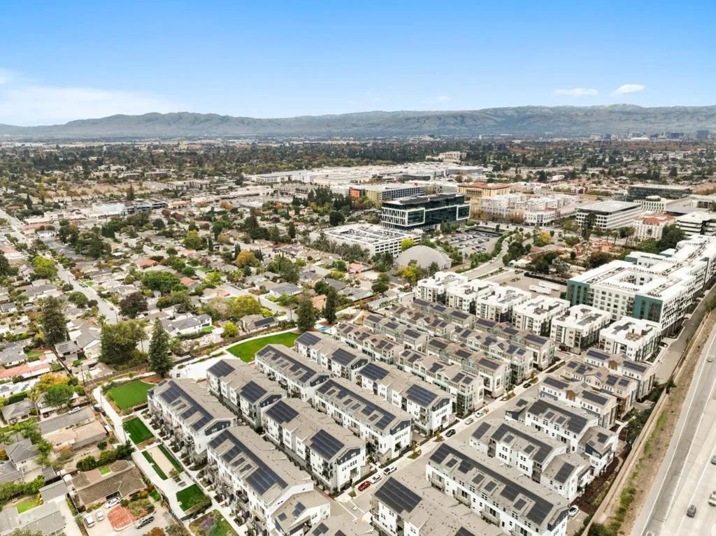 Welcome to this stunning 3-bedroom, 2.5-bathroom, 2-level end-unit townhouse-style condo built in 2022. Soaring high ceilings and recessed lighting flow throughout the second-floor living area, where the open-concept layout seamlessly unites the living room and kitchen. The kitchen features a large island and stainless-steel appliances, perfect for daily living and entertaining. The master suite is a true retreat, boasting abundant natural light, a spacious bathroom with dual sinks and a shower, a balcony, and a generous walk-in closet. Each bedroom has its own thermostat for personalized comfort, and the end-unit location brings extra sunlight into every room. On the first floor, you'll find a large half bathroom and a flexible room ideal for an office or additional storage. Highlights include central A/C, leased solar panels, a modest HOA fee, an attached 1-car garage with EV charger, and access to a community playground. Located in San Jose's vibrant 95117 neighborhood, this home is just across the street from Santana Row with luxury boutiques and award-winning restaurants, near Valley Fair Mall, and offers convenient access to Highways 17, 280, and 880. You are also minutes from major tech employers, making it an ideal combination of comfort, convenience, and lifestyle.