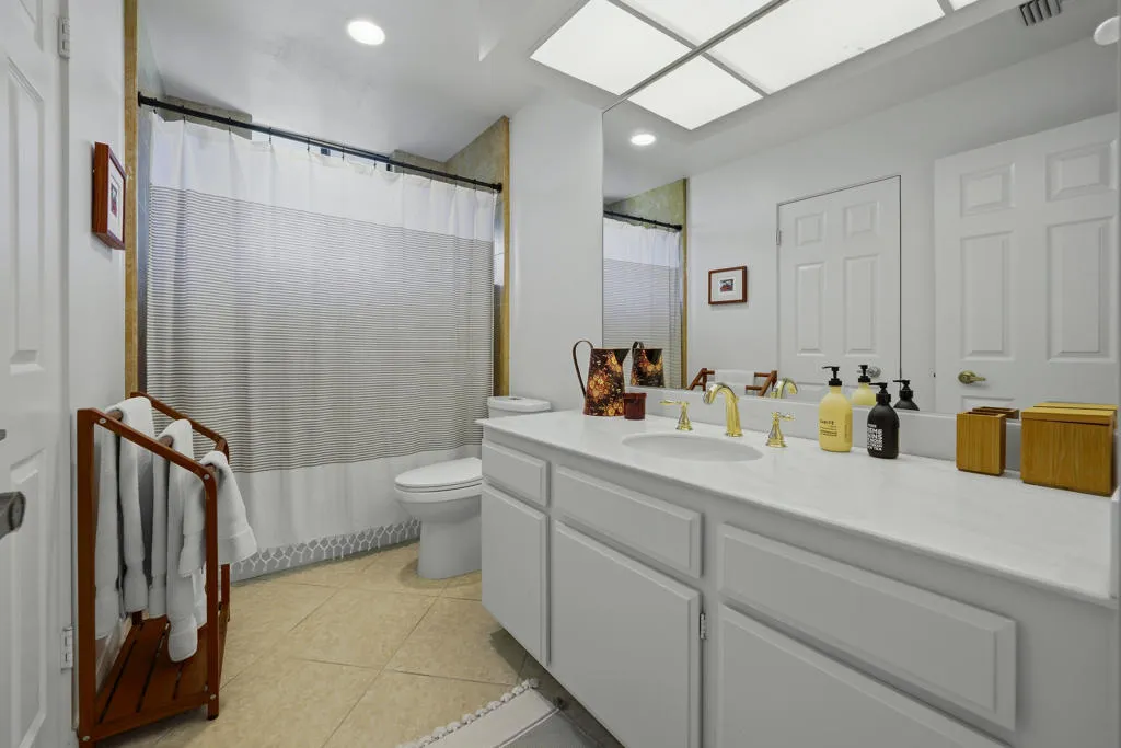 Highly desirable in The Springs and in pristine condition, this 3-bedroom, 3 bath home has been upgraded with porcelain tiles, marble fireplace, custom shutters throughout. Major recent upgrades include 27 Owned solar panels and 2 new HVAC systems. Other upgrades include kitchen custom cabinets with an Italian flare, granite countertops and stainless-steel electric appliances. Skylights strategically placed throughout the home bring in wonderful natural light as do the many floors to ceiling windows and sliding glass doors. Recessed lighting and tall ceilings also add to the spaciousness. All bathrooms have porcelain tiles and marble showers. Both ensuite bathrooms have marble rain showers. Front private patio has lush landscaping and mountain views. The wrap around lanai offers tranquil greenbelt and lake views. The community pool and spa, surrounded by privacy green hedges, is just steps away. In addition to the 2-car garage, there is a separate golf cart garage door. The Springs Country Club is known for its majestic views, beautiful landscaping, newly remodeled championship golf course, tennis club, pickleball, new clubhouse, fitness center, and 24/7 monitored/guard gated security. The Springs is where you belong!