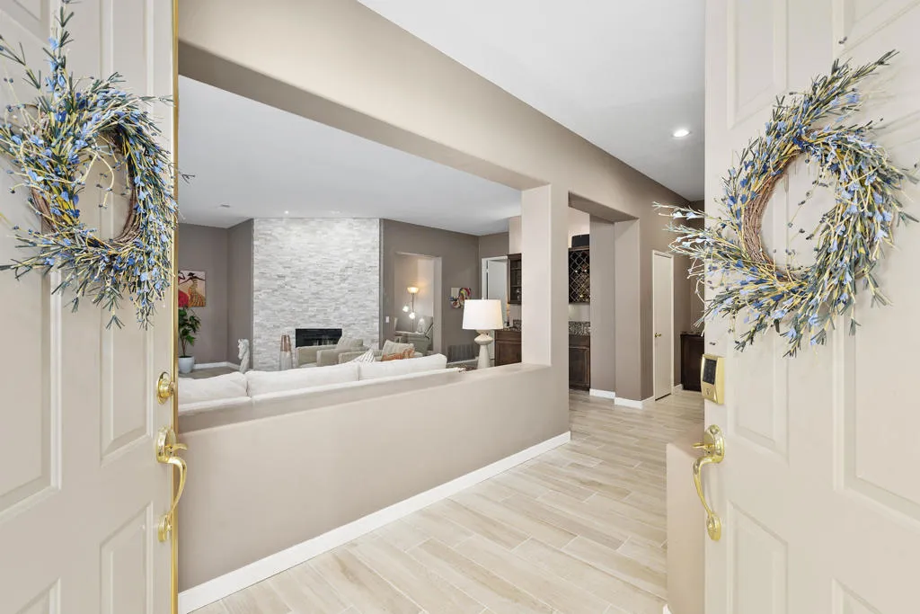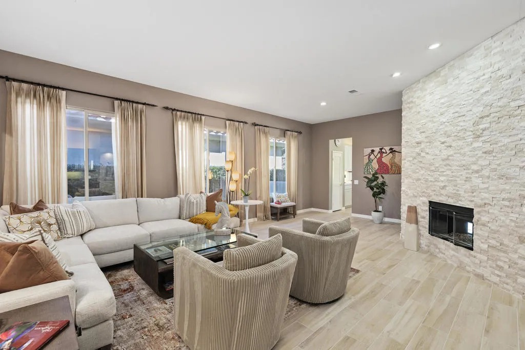 This beautiful remodeled single-story move-in ready 2600 sq ft home offers spacious living featuring 2 Bedrooms, 3 full baths and is set up with an open office/den with elegant built-ins. The quest bedroom with it's own outside private entry also has access directly from the home. This bedroom/casita has it's own full bath and walk-in closet. The third full hallway bathroom suffices as a guest bathroom. The home has stunning fairway, mountain, lake and pool views! There are no attached walls, no stairs, and is the largest single-story floor plan in this community. As you enter the home through the double front doors you immediately notice the openness of this home with its tall ceilings, new tile flooring, and the focal point of the stunning split stone floor to ceiling double fireplace facing both the living room and family room... all of which adds to the light and bright atmosphere of this gorgeous home. The chef's kitchen with quartz countertops includes a center island offering casual seating. From the kitchen you can exit the sliding glass doors to the inviting private back yard patio with professional desert landscaping, pool/spa with new pebble-tec finish and rock waterfall, built-in BBQ, and a automated awning for additional shade. The enormous Master Suite w/fairway and pool views has a massive walk-in closet with built-ins, custom cabinets with loads of storage, dual sinks, a large tub with a separate shower. This home also has it's own separate laundry area with a sink and storage. Additional highlights include an attached 2-car garage plus a 3rd garage for a golf cart. This golf community also offers a 10-hole golf course at a minimal annual cost! Rancho Mirage CC is ideally located in Rancho Mirage and is close to Eisenhower Medial Center, shopping, dining and entertainment, minutes to the The River, and of course the El Paseo Shopping and Dining District. This home has it all and can be either your perfect seasonal retreat or your full-time sanctuary. Don't miss out this one!