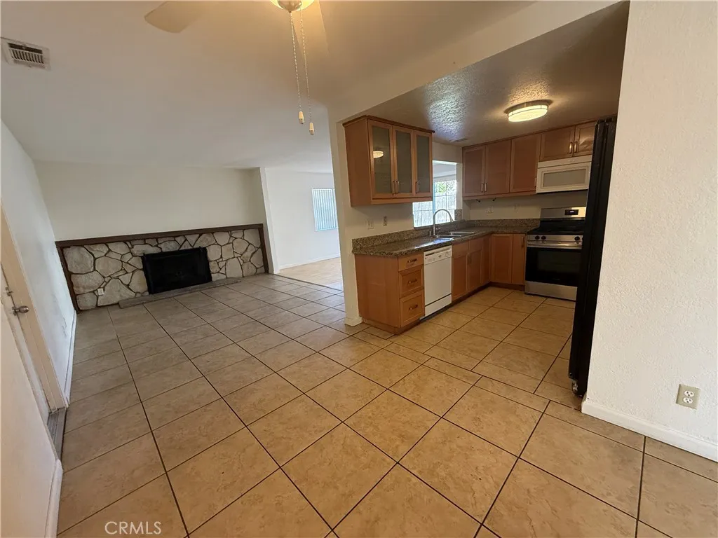The kitchen is both stylish and functional, showcasing granite countertops, attractive cabinetry, updated fixtures, and a convenient pass-through to the family room—perfect for entertaining or staying connected while hosting. The expansive family room offers a cozy fireplace, ample living space, and sliding doors that open to the backyard, creating an easy indoor-outdoor flow ideal for indoor and outdoor get togethers.