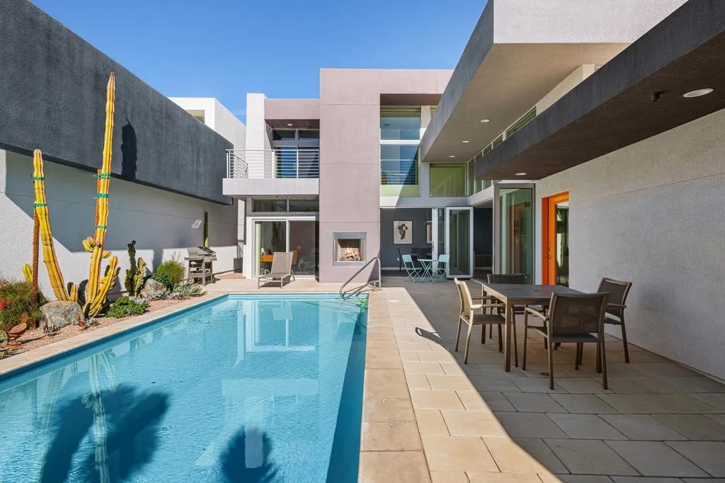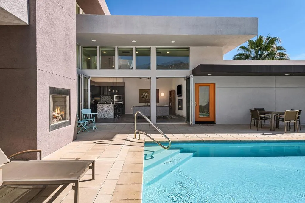 Experience the pinnacle of downtown Palm Springs living in the exclusive gated community of SOL! This stunning modern single-family home is a masterpiece of design, featuring soaring ceilings and expansive walls of glass that flood the space with natural light and create an inviting, vibrant ambiance. The open-concept layout is an entertainer's dream, with double collapsing doors that seamlessly blur the line between indoor and outdoor living. The sleek kitchen is a chef's delight, outfitted with stainless steel appliances, a spacious island, and everything you need to host in style. This home offers two luxurious primary suites one on the main level and one upstairs each providing ultimate privacy, spa-inspired bathrooms, and generous walk-in closets. A versatile loft space upstairs lends itself perfectly to a home office, gym, or cozy TV lounge. Step outside to your private oasis, where a sparkling pool, outdoor fireplace, and ample space for dining and lounging set the stage for unforgettable gatherings under the desert sky. This is modern desert living at its finest--welcome home!