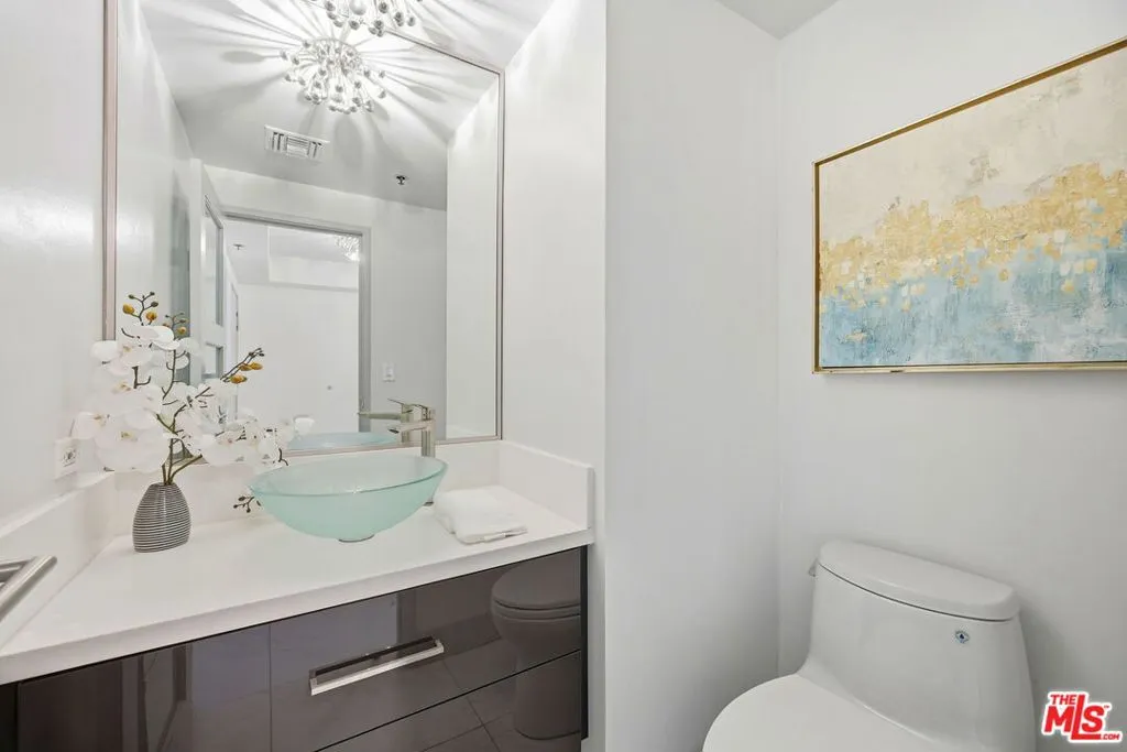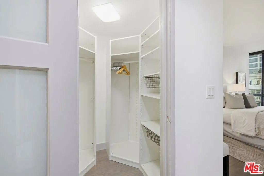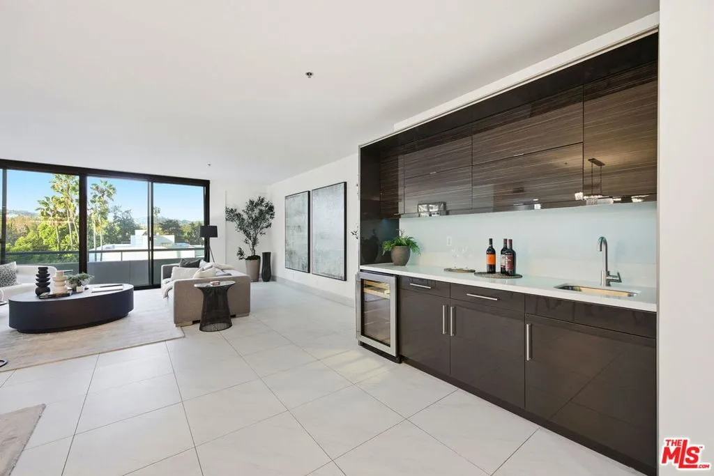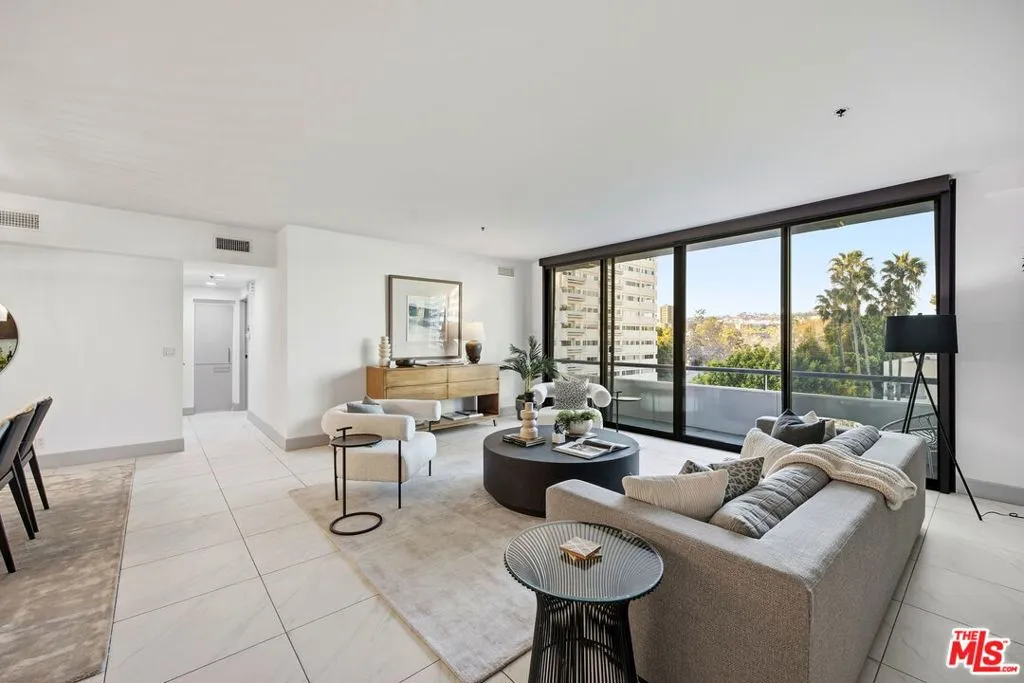 Exceptional Opportunity!!! Discover a sleek and chic, meticulously remodeled 2 bedroom, 2.5 bathroom condominium located in the Wilshire Manning, a full-service high-rise on the Wilshire Corridor. The residence features a formal entry leading into light-filled spacious living and dining areas. White porcelain floor tiles extend throughout the main living spaces, creating a bright and airy atmosphere. Floor-to-ceiling double sliding glass doors enhance natural light and showcase picturesque city and mountain views, while built-in custom cabinetry equipped with a wine fridge adds both style and functionality. The open-concept kitchen is outfitted with top-of-the-line Viking appliances and stylish, high-end cabinetry. A sizeable quartzite central island serves as the focal point, ideal for effortless entertaining and culinary creativity. The spacious primary bedroom features elegant wood flooring, double layered windows for shielding sound, revealing Ocean and City views. A large walk-in closet completes the personal retreat. The spa-inspired primary bathroom showcases a walk-in shower, concrete walls, and a double vanity, all embodying a clean, modern aesthetic. The secondary ensuite bedroom also features wood flooring, double layered window unveiling Ocean and City views, a walk-in closet and a full bath, ensuring comfort and privacy for guests or family. A side-by-side washer and dryer are conveniently situated in the hallway, away from the kitchen for optimal functionality. Residence includes two separate parking spaces, with one equipped with its OWN EV CHARGER for electric vehicles. Building amenities include 24-hour security and valet parking, an elegant lobby, fitness center, pool, and a conference room for residents. This home is move-in ready and offers a neutral palette, making it easy to personalize and create an ideal environment. Building is conveniently located close to 405 freeway, UCLA, Westwood, Century City and Beverly Hills...moments away from best shopping, dining and entertaining destinations.