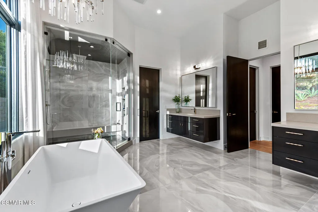 The absolute premier newly built North Ranch estate. An awe inspiring contemporary farmhouse with an ideal cul-de-sac location in upper North Ranch! Privately gated trophy custom on over two acres with stunning mountain views! No expense was spared to create this true masterpiece! Livable as mostly one level, this amazing open concept floor plan spans over 7000 square feet. Features include a grand 'great room' with 10 foot multi-slide Fleetwood glass doors, floor to ceiling stone fireplace and a beautifully designed soaring ceiling with wood accents. There is also a separate theater/bonus room (6th bedroom), two sided glass wine cellar, walk in wet bar and so much more! Up the floating stairs you will find an additional family room and two large secondary en-suite bedrooms, one of which serves as a second primary suite option. Perfect for guest quarters! The home is elevator ready if desired. The main level primary suite is extraordinary. There are two large walk in closets, tremendous fireplace, sitting room and a Four Seasons quality bathroom with steam shower and soaker tub. The resort quality grounds are second to none. There is a 90 foot infinity pool enhanced by fire & water features. There is also 1300 square feet of covered outdoor living, barbecue center and massive manicured lawns. Other amenities include a smart home and solar systems, FIVE car garage, Sonos sound, security cameras, large glass pivot front door and so much more. A very exciting estate to hit North Ranch.