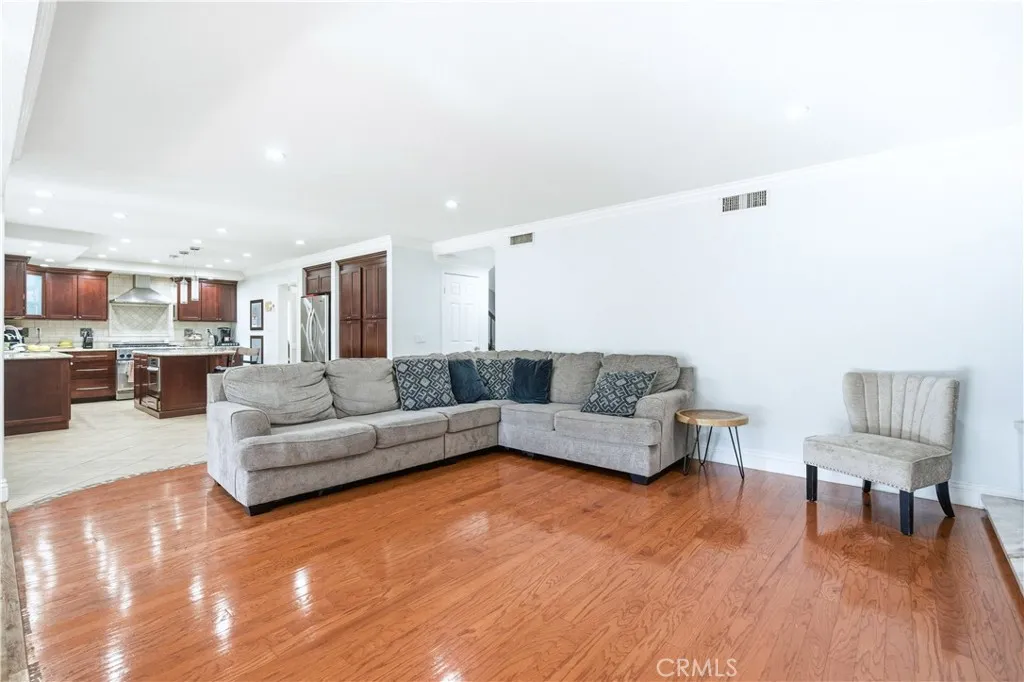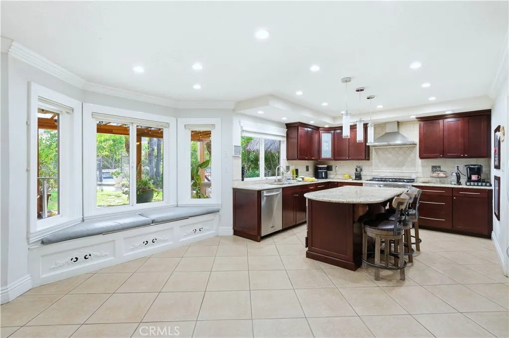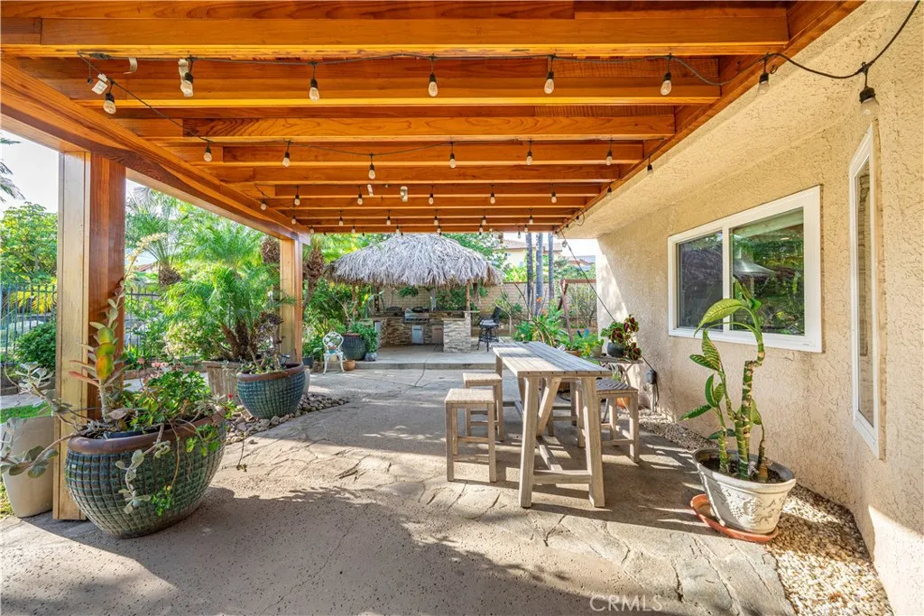 The impressive two-story layout spans approximately 3,487 square feet and features 5 bedrooms and 5 bathrooms, thoughtfully designed to balance functionality with refined style. Upon entry, soaring two-story ceilings and an open floor plan create a bright, expansive atmosphere ideal for entertaining and comfortable living. At the heart of the home, the spacious family room features a built-in bar and flows seamlessly into the den and open gourmet kitchen, creating a natural gathering space. The kitchen offers granite countertops and a commercial-grade refrigerator ideal for hosting. A wet bar and adjacent game area further enhance the entertainment appeal. Set on a generous lot, the backyard serves as a private retreat. Enjoy a resort-style pool and spa with waterfall feature, complemented by a covered patio with built-in BBQ and decorative palm-style covering that adds a tropical touch. An oversized rear patio area and an additional patio off the family room provide multiple areas for indoor-outdoor enjoyment. Mature tropical landscaping and an array of fruit trees, including mango, lemon, lime, pomegranate, avocado, and persimmon, add beauty and character to the outdoor setting. Upstairs, the primary suite includes a spacious balcony overlooking the backyard, offering a peaceful space to relax and enjoy the views. The downstairs fifth bedroom includes an en-suite bathroom and flexible layout options. A portion of the three-car garage has been incorporated into this area, providing additional functional space. Buyers to verify all features, permits, and potential uses. Additional highlights include surround sound in the bonus room and solar panels for energy efficiency (buyer to verify system details). Conveniently located near schools, parks, shopping, dining, and major transportation routes, this home offers a rare combination of size, amenities, flexibility, and outdoor living.