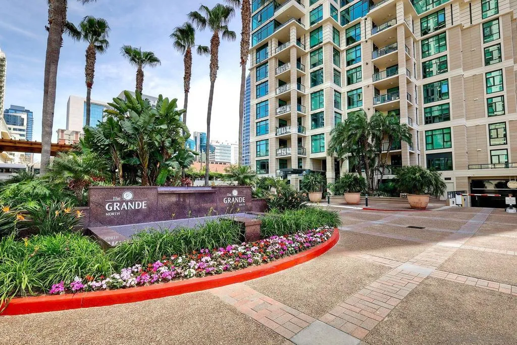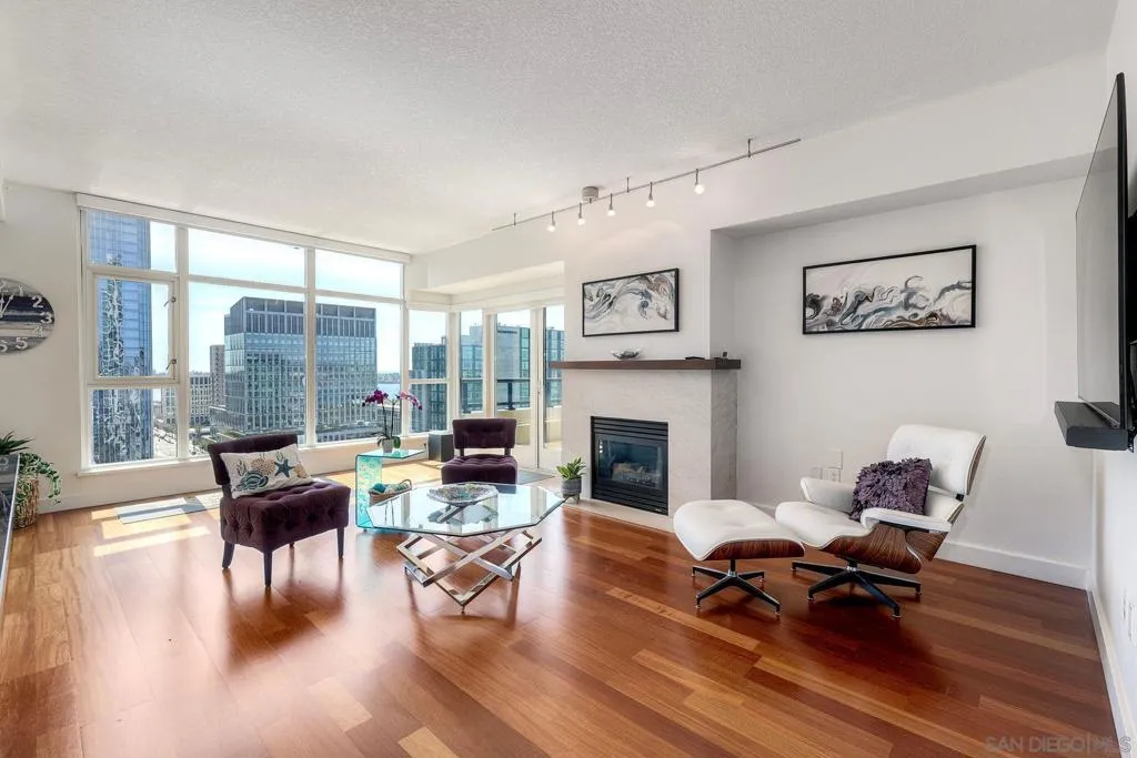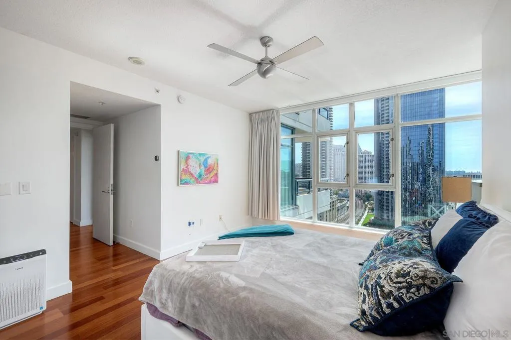 Elegant ocean and bay view residence in Grande South featuring the most desirable floorplan with two bedrooms plus a bonus room. Situated on the 18th floor, the home offers unobstructed southwest-facing views of San Diego Bay, the Pacific Ocean, and the city skyline. Refined interiors include a spacious primary suite, hardwood floors throughout, a cozy fireplace, Nest thermostats, battery-operated window shades, and a gourmet kitchen with a new GE Monogram refrigerator. The expansive balcony extends the living space and provides the perfect setting to enjoy panoramic views and sunsets. 2 side by side parking spaces. Grande South amenities include 24-hour concierge service, meeting room, party room and lounge with full kitchen and fireplace, visitor’s suite for guests, landscaped gardens, private tree-lined courtyards, individual storage lockers, bicycle storage, an 80-foot outdoor swimming pool, whirlpool spa, sauna and steam rooms, changing rooms with lockers, and a fully equipped exercise room. Floor plan is in associated documents