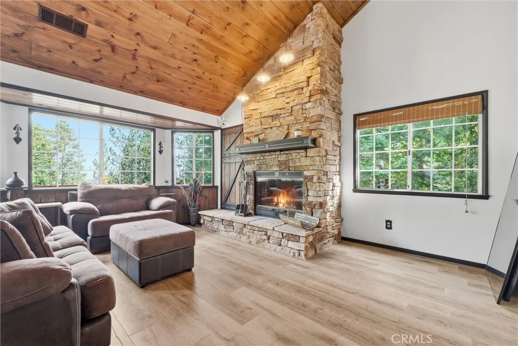 Set on over a third of an acre at the end of a quiet cul-de-sac, this lake rights home offers privacy and a peaceful mountain setting. Located at 276 Augusta Ct, the property features level entry from both the front deck and the two-car garage. Inside, the living room showcases vaulted wood ceilings and a stone fireplace, creating a warm and inviting space. The open living and dining areas connect to the kitchen with a butcher-block island, stainless steel appliances including a Viking range, and wood accents. The main level includes access to a spacious deck, ideal for outdoor enjoyment. Upstairs is a large bonus room or optional fourth bedroom with a stone fireplace and vaulted ceiling. The lower level offers three additional bedrooms and two updated bathrooms, including a spa-inspired primary bath with frameless glass and custom finishes. Wood and laminate flooring runs throughout, and multiple decks provide ample outdoor living space. With lake rights and access to hiking, lake activities, and year-round outdoor recreation, this well-maintained home is ideal as a full-time residence or relaxing mountain getaway.
