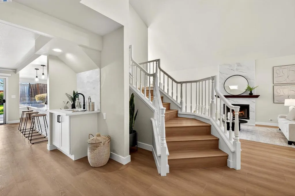 Do not miss this luxuriously remodeled larger 4 bedroom with 1 full bed and bath downstairs, located on an inner neighborhood street with STUNNING VIEWS of the San Ramon hills. From the moment you step inside the EAST facing front door you are greeted with soaring two-story vaulted ceilings, abundant natural light, wide plank flooring, new lighting, and an elegant formal living and dining room with a statement floor to ceiling tile fireplace. The FULLY REMODELED KITCHEN is a chefs dream featuring custom soft close white cabinetry, quartz countertops, marble backsplash, stainless steel french door oven, pendant lighting large peninsula with abundant seating and adjacent built-in bar area with sink, perfect for entertaining all your guests. At the top of the stairs you will enter the spacious primary suite with grand vaulted ceilings, two separate closets and a private balcony with expansive views. Additional bathrooms showcase all custom floor-to-ceiling tile showers and modern vanities with stone counters. The large usable backyard has two separate patio areas, no rear neighbors, large grassy area, newer fences, and a large side yard. Plenty of room for a pool, ADU , or side-yard access. Just turn the key and move right in.