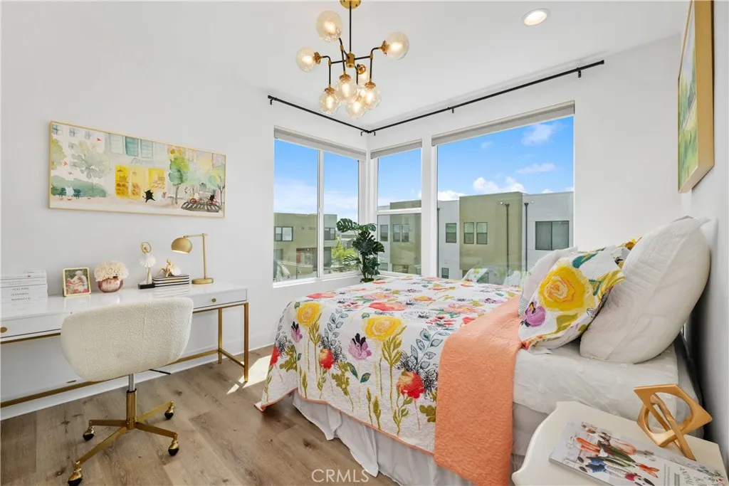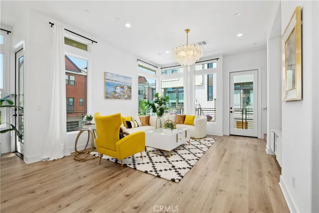 Like-New Luxury Upgraded Turnkey End-Unit Residence in Irvine Great Park Neighborhood–Exceptional Value! Just Minutes’ Walk to top-rated Portola High School and Solis Park School (K–8) in the award-winning Irvine Unified School District—daily drop-offs are skipped, making life a true breeze for parents. 3 beds, 2.5 baths, and 1,812 sqft of living space. Premium End Unit boasts superior natural light, enhanced privacy, a quieter setting, a larger front yard, and an L-shaped deck. The expansive Open-Concept Layout seamlessly connects the kitchen, living, and dining areas, enhanced by 10-foot ceilings to create a harmonious flow of space. Oversized windows paired with floor-to-ceiling doors bathe the interiors in abundant natural light, accentuating the home’s spacious design and luxurious appeal. Tasteful upgrades include whole-house wood flooring, whole-house water softening system, and elegant chandeliers. Stunning primary bedroom suite features a walk-in closet, dual vanity, and a walk-in shower. Two secondary bedrooms are generously sized too. The first floor offers ample storage closets and direct access to a side-by-side 2-car garage. Energy-saving features include leased solar system, EV charger pre-wire, energy-efficient windows,and tankless water heater. Just minutes from Woodbury Town Center, Irvine Spectrum Center, and Kaiser Permanente, etc. Enjoy Great Park’s world-class recreational amenities and the state-of-the-art sports complex, with easy access to I-5, 133, 405, and 241. Only 18–25 minutes’ drive to Newport Beach and Laguna Beach.