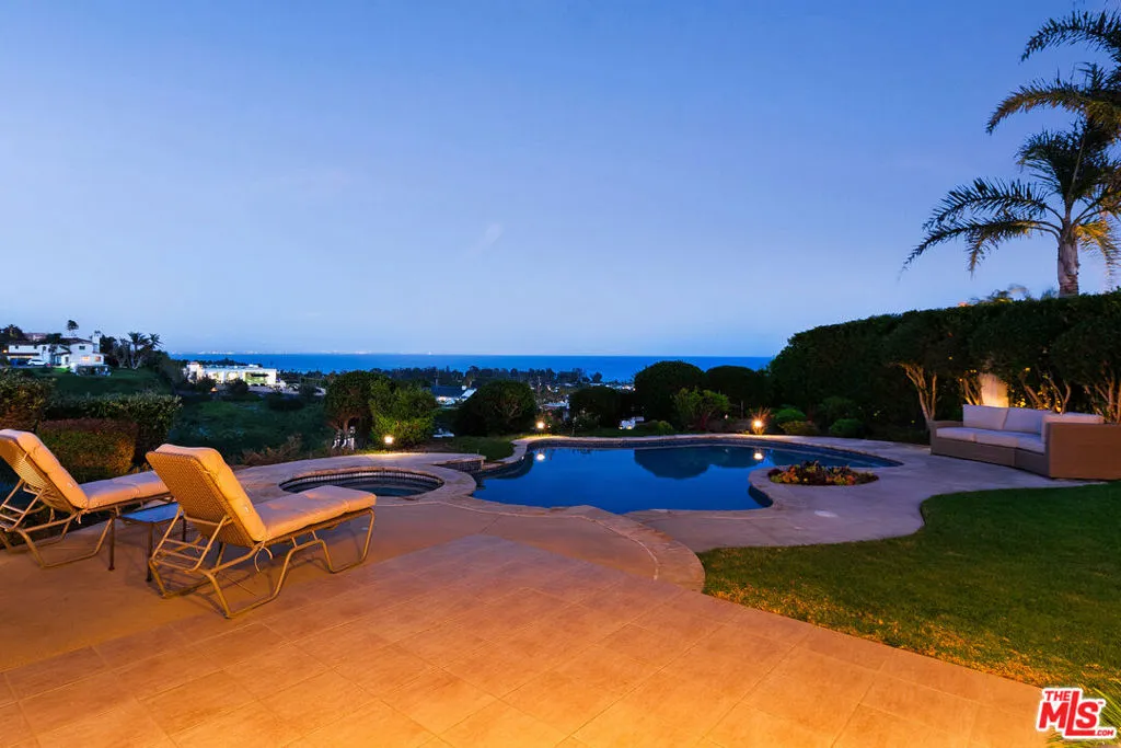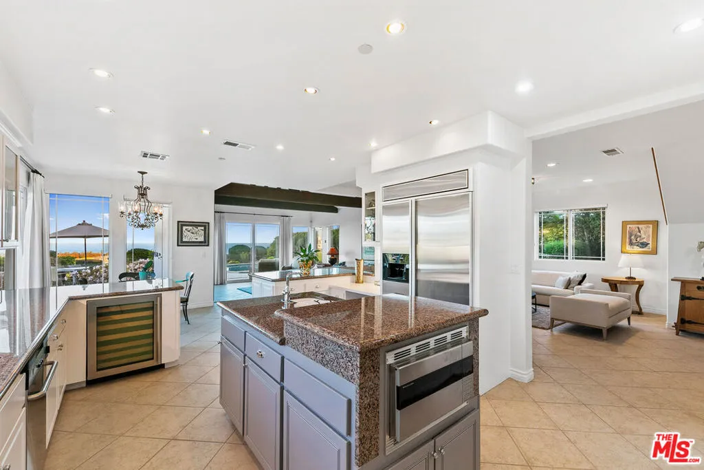 Behind gates on approximately two private acres, this five-bedroom Malibu home is positioned to capture wide-open views of the Pacific Ocean, city lights, and the Santa Monica Mountains. Spanning roughly 3,979 square feet, the property offers privacy, scale, and a calm, open layout designed for everyday living and entertaining. The main living area features vaulted, beamed ceilings and a fireplace, creating a strong central gathering space. The kitchen is anchored by a large island with integrated wine storage and opens directly to a casual dining area, keeping the layout functional and connected. The primary suite is set apart, with vaulted ceilings, an ocean-view balcony, walk-in closet, dual vanities, and a soaking tub. Four additional bedrooms provide flexibility for guests, family, or home offices. Outside, the grounds include landscaped lawns, a pool and spa, and multiple terraces to enjoy the views and setting. Located just minutes from Zuma Beach, Point Dume Village, Trancas Market, and Malibu's top hiking trails and surf breaks, the property offers true privacy without sacrificing convenience. A rare opportunity to experience space, views, and location, this is a home that needs to be seen in person.