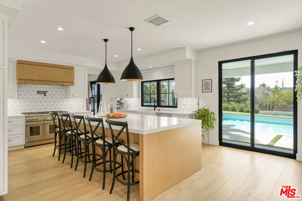 Nestled in the quiet and serene neighborhood of Encino Hills and surrounded by mature trees, this recently and completely renovated home offers stunning views and a thoughtfully designed floor plan featuring five spacious en-suite bedrooms, a powder room and library that could also function as a playroom. The expansive primary suite includes a large walk-in closet and a peaceful seating area, creating a true retreat. A beautiful wooden deck on the second floor, extending across the length of the house, provides a panoramic viewing point. The gourmet kitchen boasts high-end stainless steel appliances and custom cabinetry, complemented by abundant natural light throughout the home. Set on nearly half an acre, the property features a sparkling pool and jacuzzi both with new tile and plaster a dedicated dog run, fruit trees, and a vegetable garden. The yard is thoughtfully divided into several seating areas, perfect for relaxation and entertaining. Additional highlights include a three-car garage, integrated smart home technology for convenience and security, and a community tennis court. Elegant interior finishes evoke a relaxed yet refined atmosphere. This home is perfect for entertaining or simply relaxing and enjoying the serene surroundings.