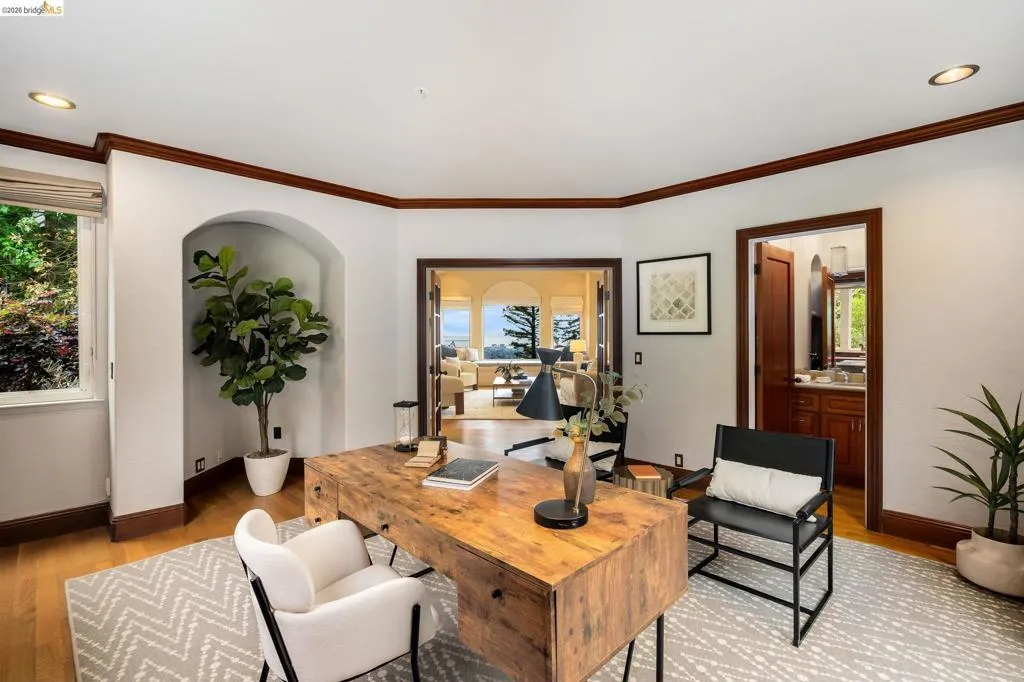 Amazing panoramic views of the San Francisco skyline, the Golden Gate Bridge, the Bay Bridge, the Richmond Bridge, and glittering bay waters define 6257 Virgo Road, a one-of-a-kind Montclair hillside estate perched on a tranquil street. More than 5,100 sq ft of refined, move-in-ready living sits on a lushly landscaped 14,544 sq ft lot, with seamless indoor-outdoor flow built for elevated everyday living and unforgettable entertaining. An expansive chef’s kitchen opens to formal living and dining rooms with soaring ceilings and walls of glass framing the views. A sunlit, dedicated office creates the ideal work-from-home sanctuary. Four spacious bedrooms and 3.5 spa-inspired baths include a showstopping primary suite with a fireplace, sitting area, and a boutique-caliber walk-in closet with custom built-ins. Downstairs, enjoy a home theater plus gym or flex space. Outside, a generous yard is enhanced by a seasonal creek and a charming handcrafted bridge, perfect for morning coffee and golden hour gatherings. Owned solar with Tesla Powerwalls, hardwood floors, and three gas fireplaces complete this exceptional offering. Minutes to Montclair Village, parks, and easy commuter routes. Views: Downtown