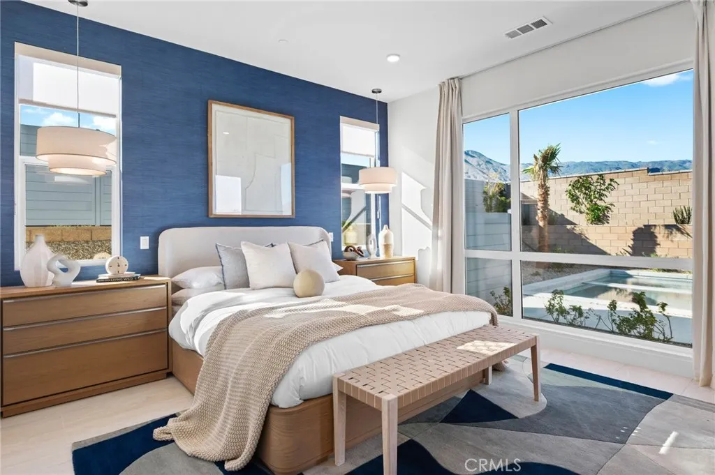 Welcome to Oasis by Crestwood Communities, a gated community offering modern desert living with breathtaking mountain views in the heart of La Quinta. This unique single-story modern home features 2,458 square feet with 3 bedrooms, 3.5 bathrooms, and a 3-car garage, and is accessed through a private gated courtyard that provides both privacy and style. Inside, soaring ceilings, striking 12x24 tile floors, and an open-concept great room are filled with natural light from front to back, enhanced by expansive sliding glass doors that create a seamless indoor-outdoor flow to the covered patio. The outdoor space is resort style, perfect for entertaining or relaxing beside the included pool and spa. The open kitchen is designed for both functionality and elegance, featuring designer quartz countertops, an oversized island with waterfall edges, modern flat panel cabinetry with warm accent lighting, soft-close hinges, and stainless-steel Bosch appliances. Each bedroom includes its own en-suite bathroom, while the primary suite offers a resort-style retreat with direct access to the covered patio and a spa-inspired bathroom, thoughtfully separated from guest bedrooms for added privacy. Solar is available for purchase or lease, and the home includes many additional amenities. Conveniently located near golf, hiking, biking, and horseback riding, yet away from traffic and congestion. Model grand opening is Saturday, January 24th. Photos shown are of the model home; the subject property is currently under construction.