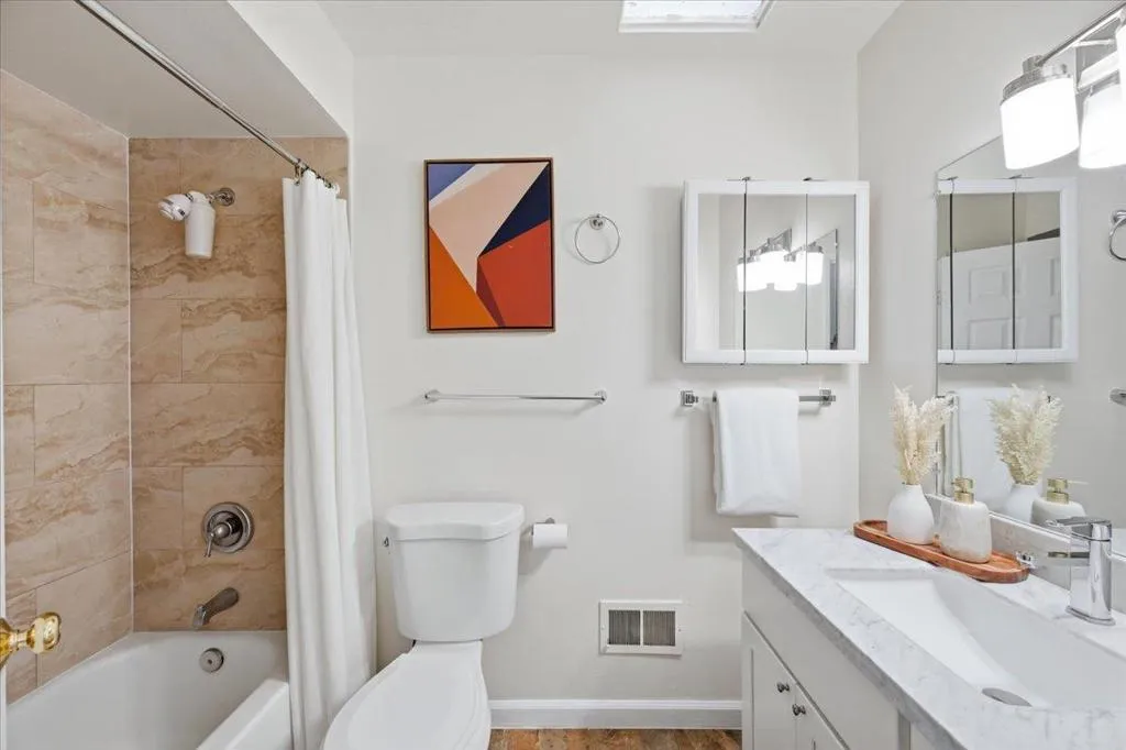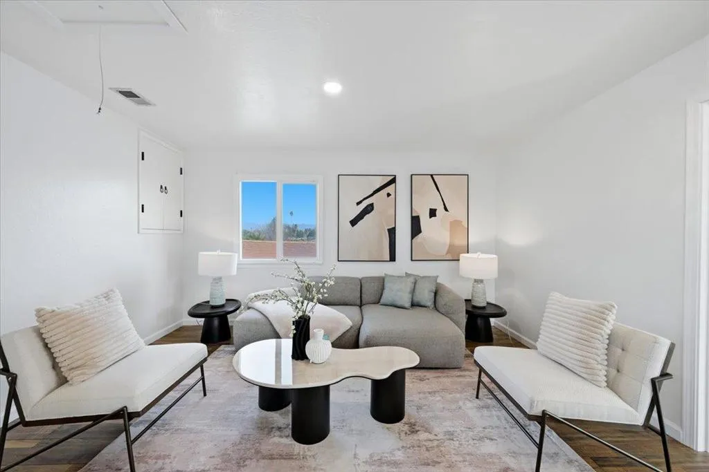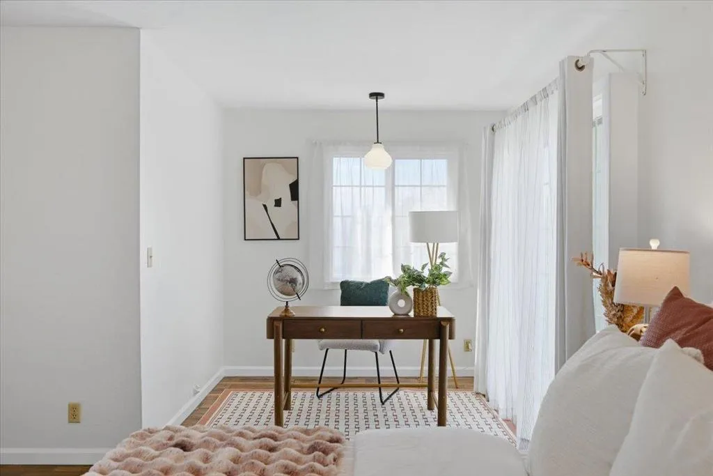Step into a world of modern elegance in this beautifully appointed residence, where an open-concept design and airy light wood flooring create a bright, seamless flow for daily living. The heart of the home is the sophisticated kitchen, meticulously designed with crisp white Shaker cabinetry, a textured tile backsplash, and a stainless steel gas range with a professional vent hood. An expansive center island, illuminated by chic pendant lighting, offers a breakfast bar that serves as the perfect gathering spot for entertaining. Private quarters are equally impressive, highlighted by a grand primary suite that features a graceful arched entry and a dedicated sitting area, offering a true retreat within the home. The spa-inspired bathrooms showcase modern luxury with double vanities, sleek integrated sinks, stone-look countertops, and expansive wall-to-wall mirrors. enhanced by a versatile home office and recessed lighting throughout, this home combines style and function in a quiet, established neighborhood near top-rated schools and shopping.