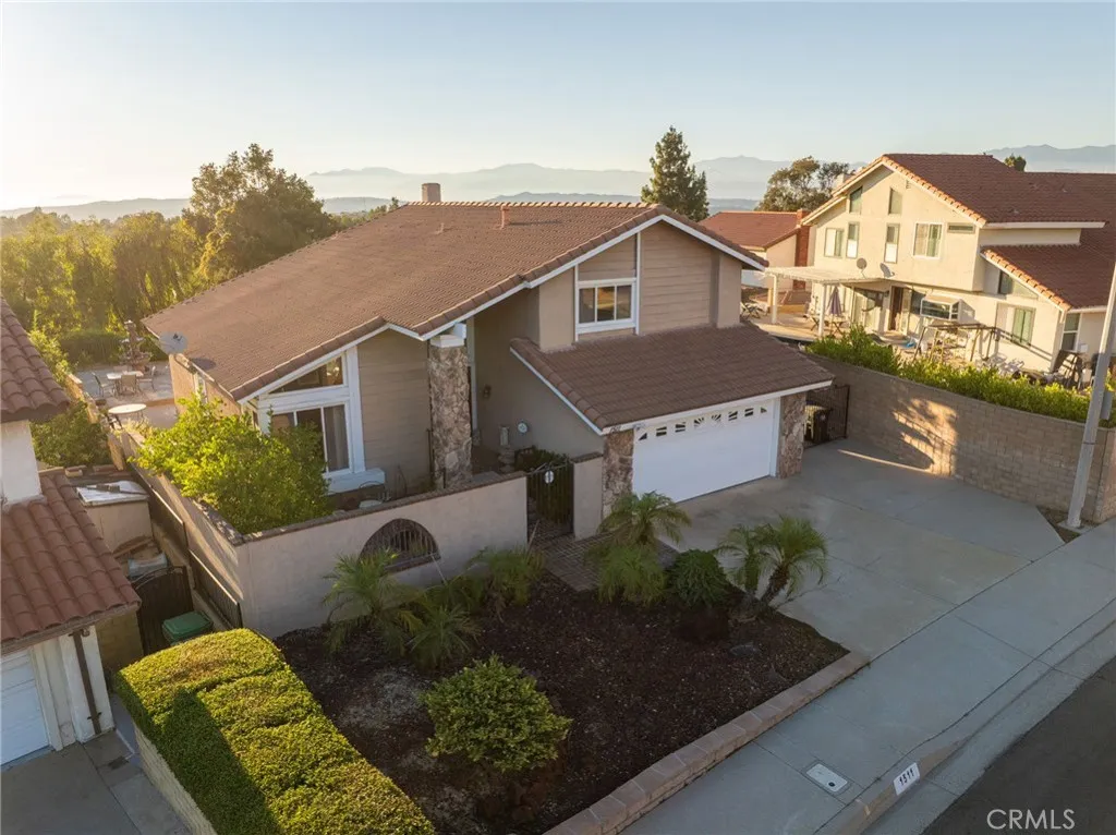 This stunning tri-level home is nestled in the hills of Diamond Bar. Offering breathtaking panoramic views and perfectly positioned to capture gorgeous sunsets from the serene backyard or the private upstairs balcony. This residence includes a highly desirable downstairs bedroom and full bath, ideal for guests or multi-generational living. When entering the home you step into the formal living room where rich wood flooring and custom crown molding add timeless elegance and character. Step down into the formal dining area which leads you to the kitchen and family room, perfect for entertaining. The kitchen is a true delight, featuring oak cabinetry, granite countertops, custom backsplash, stainless steel appliances including a 5-burner stove, brand new sink, faucet, and garbage disposal, also an eat-in dining area. Upstairs, the primary suite is a peaceful retreat with double-door entry, two large closets (including a walk-in), and additional hidden storage closet behind the paneled wall, and a private balcony with unobstructed views of the surrounding hills. The ensuite bathroom boasts dual sinks, and a jetted bathtub with a window to take in the gorgeous view. Two additional guest bedrooms and a full bathroom with a tub/shower combo complete the top level. Accessibility features are present in every bathroom, promoting safety and ease of movement. Thoughtfully upgraded, the home includes dual-paned windows, a 4-ton AC unit, stair climber to provide added ease for navigating between levels, new security system with cell phone access, indoor laundry, and the home has been repiped with PEX plumbing. The downstairs bathroom features a walk-in shower with new brass fixtures. Outside you will enjoy a tranquil and private front courtyard with a mature lemon tree, a covered backyard patio, and a lower terrace that could be perfect for a future jacuzzi or fire pit. The backyard is adorned with an array of fruit trees including orange, avocado, peach, nectarine, pomegranate, and loquat. Landscaped beautifully with a large fountain, it is a retreat you never have to leave home to enjoy. A 2-car garage and extended driveway offer plenty of parking, as well as additional parking that is readily available along the street with long stretches of curb for ample space for your guests. Located near top-rated schools, shopping, dining, and easy access to the 60 and 57 freeways, this exceptional home offers comfort, convenience, and stunning natural beauty.