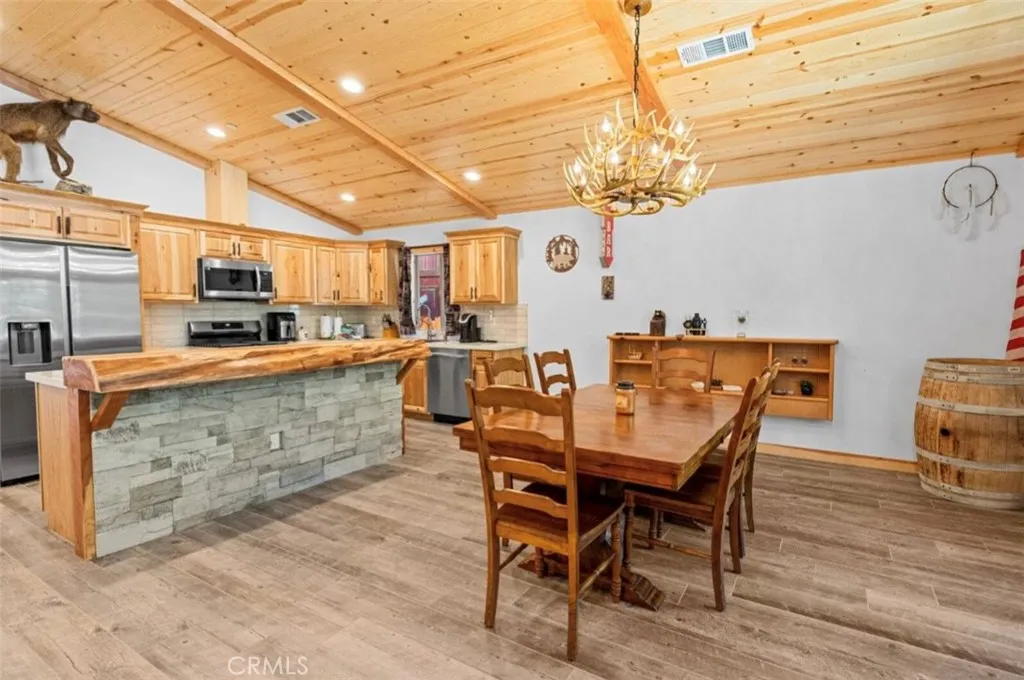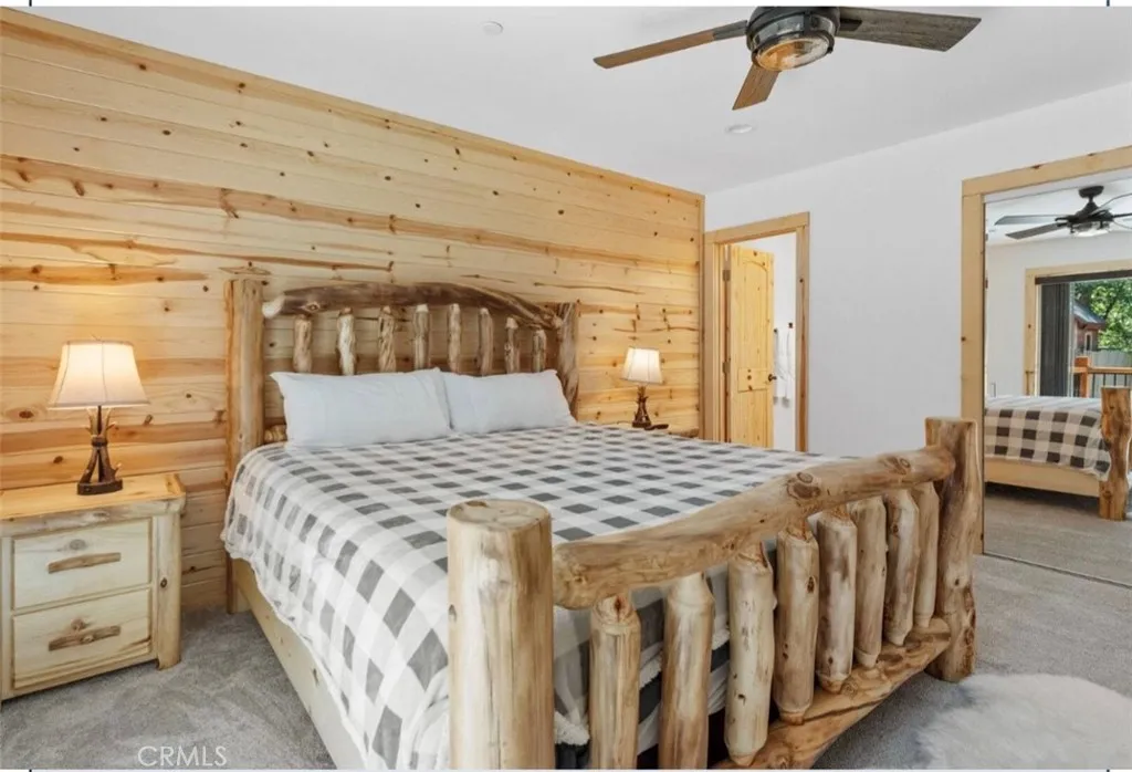 Accepting backup offers!!! Single-story log-style home ideally located between the Village and Snow Summit. This well-crafted mountain retreat features cedar siding, an open floor plan, and vaulted knotty pine ceilings. The kitchen offers granite slab countertops and stainless steel appliances, including refrigerator, range, dishwasher, and microwave. The home includes three bedrooms and two full baths, with a primary suite featuring an ensuite bath and sliding door to the back deck. Tile flooring accents the main living areas, with carpeted bedrooms for comfort. Hallway washer/dryer hookups and fire sprinklers add convenience and peace of mind. Enjoy owned solar panels for energy efficiency, a deep lot with a large flat backyard, and an attached one-car garage with tall ceilings and EV charging wiring. Ample off-street parking. Minutes from the Village, ski slopes, lake, shopping, and dining—offering modern comfort with classic mountain charm.