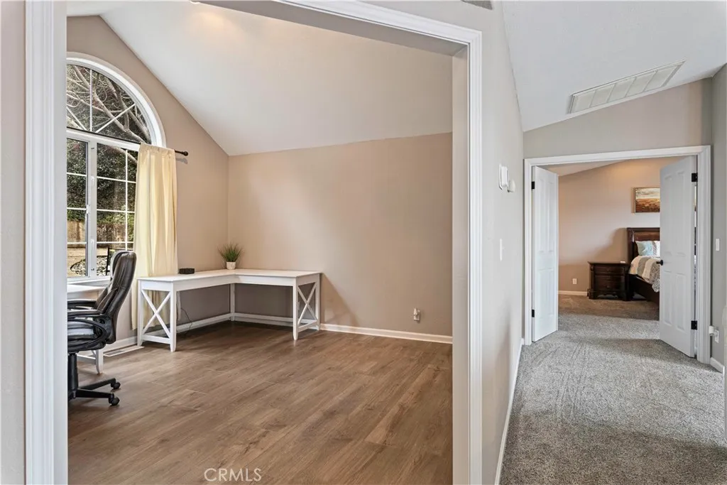 The entry-level primary suite includes vaulted ceilings and a spacious walk-in closet with custom organizers. This level also features the kitchen, dining area, living room, and office. Downstairs, you’ll find guest bedrooms, a media room/den, bathroom, storage or hobby room, and large deck—ideal for relaxing while taking in the views.