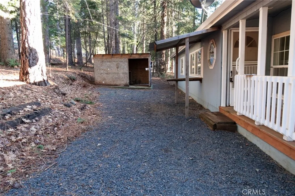CHARMING HUD home on over an acre offers a peaceful retreat in Forest Ranch. Located on 1.27 acres, this 1,308 sq ft manufactured home is on a permanent foundation and features 2 bedrooms and 2 bathrooms. The interior includes a living area with a free-standing wood-burning stove, adjacent dining/family room, and a kitchen with ample counter space, a large pantry, and updated vinyl flooring. A separate breakfast area and an indoor laundry room are included. Flooring consists of laminate in most rooms, carpet in the second bedroom, and linoleum in the kitchen and bathrooms. Both bathrooms have skylights. The primary bedroom includes large closets, a linen closet, an en-suite bathroom, and a soaking tub. Exterior features include a partially covered wraparound porch, fully fenced parcel, circular driveway, RV parking with hookups, and a 29-foot-wide gated entry. The property includes an approximately 900 sq ft garage/shop with a half bath and concrete driveway. Additional features include double-pane windows with blinds, ceiling fans, an underground 1,250-gallon concrete water storage tank, and a shared well with a recorded shared well agreement. Property is sold in as-is condition. Buyer to verify all information to their satisfaction.