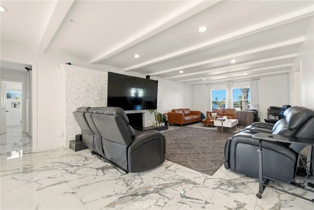 Welcome to 1301 Paseo Grande in Corona, a well-appointed home designed for everyday comfort and easy entertaining. The property offers multiple spacious living areas with abundant natural light, including a formal living room with fireplace and coffered ceilings, and a separate family room with exposed beams, a second fireplace, and sliding doors that open to the backyard. A dedicated office or den with custom built-ins provides flexibility and may be used as a fifth bedroom, complete with a private full bathroom and separate exterior access. Upstairs features four bedrooms, including two primary-style suites for flexible living arrangements. The main primary suite offers plantation shutters, space for a sitting area, a walk-in closet with built-ins, and an ensuite bath with soaking tub and glass-enclosed shower. A separate laundry and utility room with extensive cabinetry adds convenience. The updated kitchen includes white cabinetry, stone countertops, a waterfall-edge island, and a professional-style range with hood and full-height backsplash, opening to the dining area for everyday living and gatherings. The low-maintenance backyard is designed for water-efficient living with extensive concrete hardscape, a covered patio with ceiling fans, an in-ground pool, and an elevated gazebo or pavilion area suitable for gatherings. Additional features include mature landscaping and solar panels.