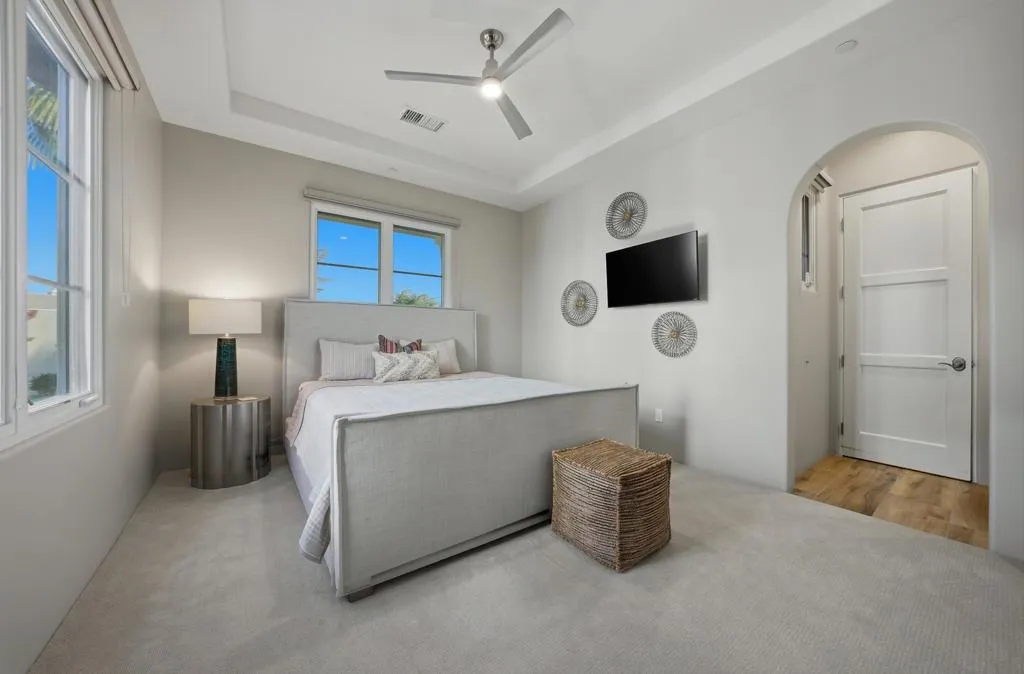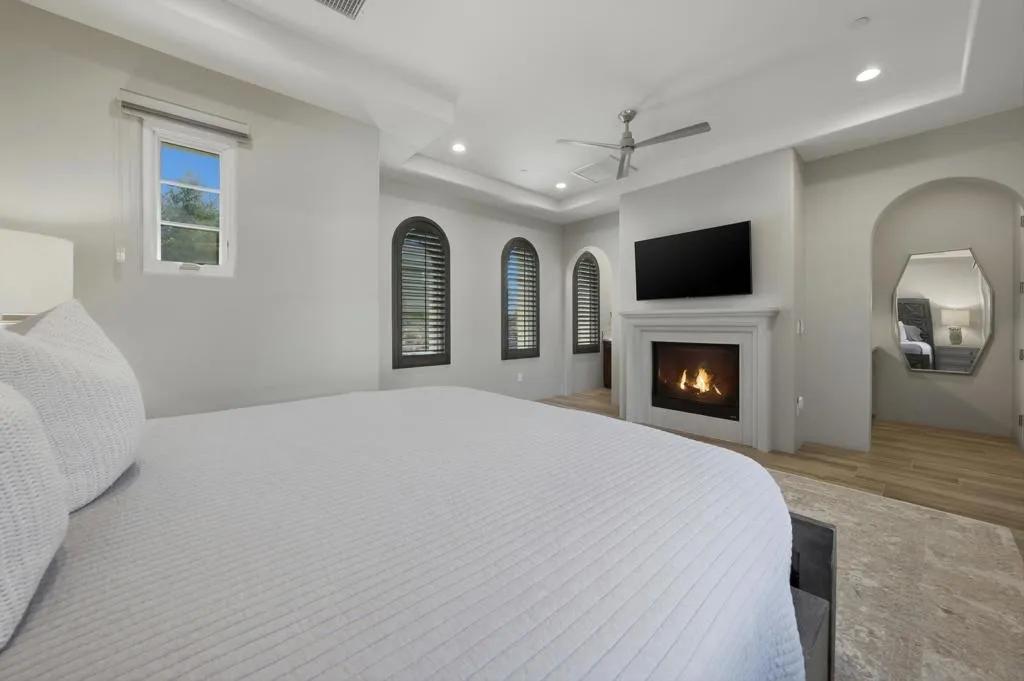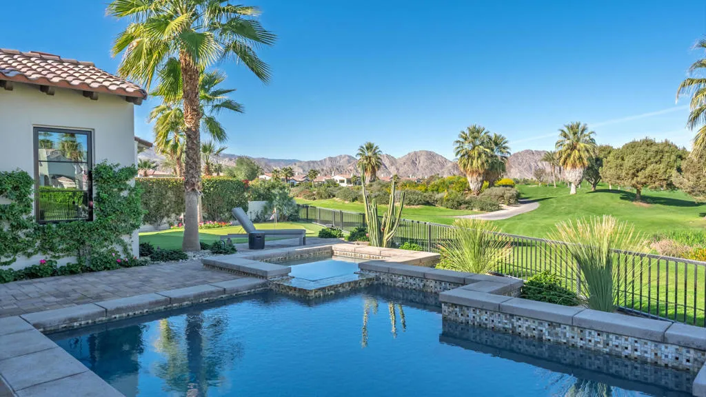 Set on a coveted end lot bordered by a lush greenbelt, this exceptional residence offers remarkable privacy and sweeping desert beauty from nearly every angle. Thoughtfully positioned to capture lake views, the 5th green, and the 6th fairway of the Rees Jones designed course. The home is further framed by dramatic vistas of the Santa Rosa and Coral Mountains, visible from both the courtyard and the backyard. The outdoor living spaces are truly special. A private courtyard welcomes you with a cozy fire pit that is perfect for evenings under the stars while the backyard is designed for both relaxation and play, featuring a personal putting green and serene golf course views that stretch into the distance. The expansive open space creates a quiet backdrop, reinforcing the home's relaxed, resort-style atmosphere. Inside, the 4-bed, 5-bath home is designer furnished, blending comfort with refined style. Wood-look ceramic tile flooring runs throughout the main living areas, adding warmth and continuity to the interior spaces. The great room is anchored by a striking stacked-stone fireplace, creating a natural focal point and an inviting atmosphere for entertaining or quiet nights in. Every detail has been curated to complement the home's surroundings, allowing the outdoor views to take center stage while maintaining a sophisticated, modern feel inside. This is a rare opportunity to own a private, view-oriented retreat where indoor and outdoor living come together seamlessly. Come live the life you've always imagined.