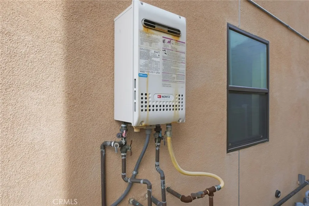 Additional features include a tankless water heater and a garage with custom cabinets and a built-in countertop, offering organized storage and added functionality.